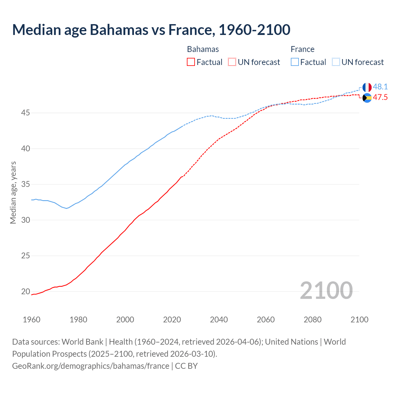 Median age Bahamas vs France, 1960-2100