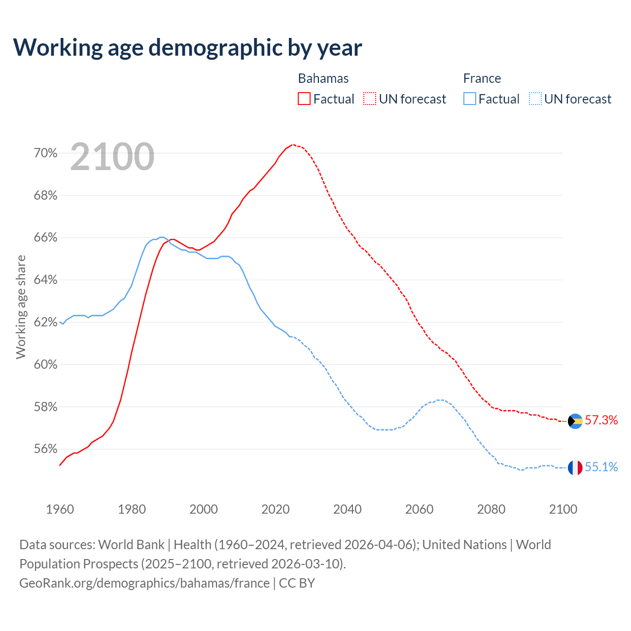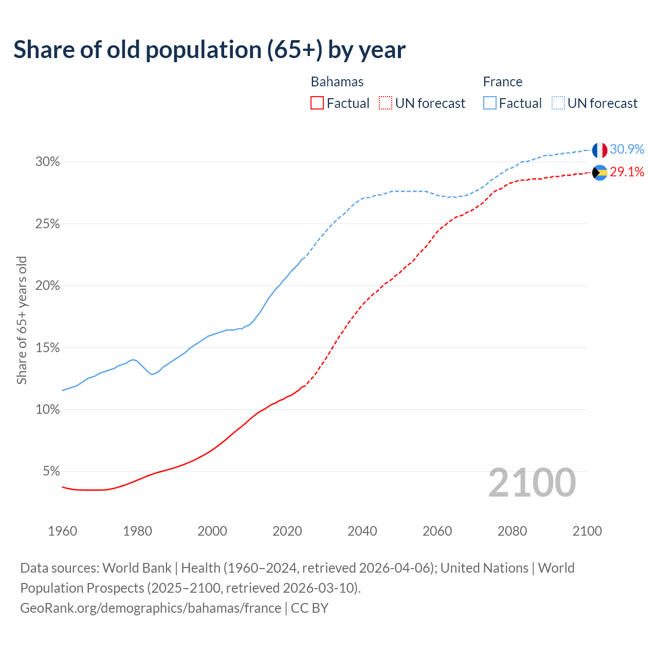 The share of older people aged 65 and over is 11.8% in the Bahamas and 22.1% in France. Life expectancy in the Bahamas compared to France .