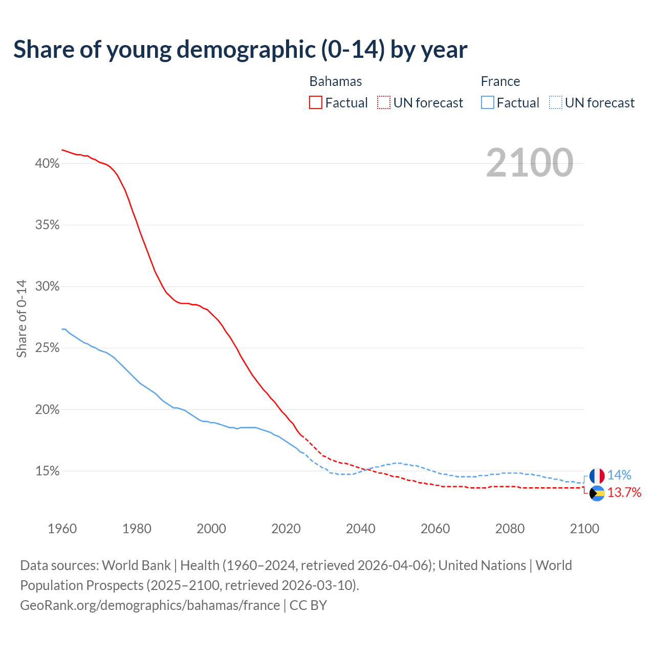 - The share of young demographic (0-15 years old) in the Bahamas is 17.9% vs 16.5% in France.