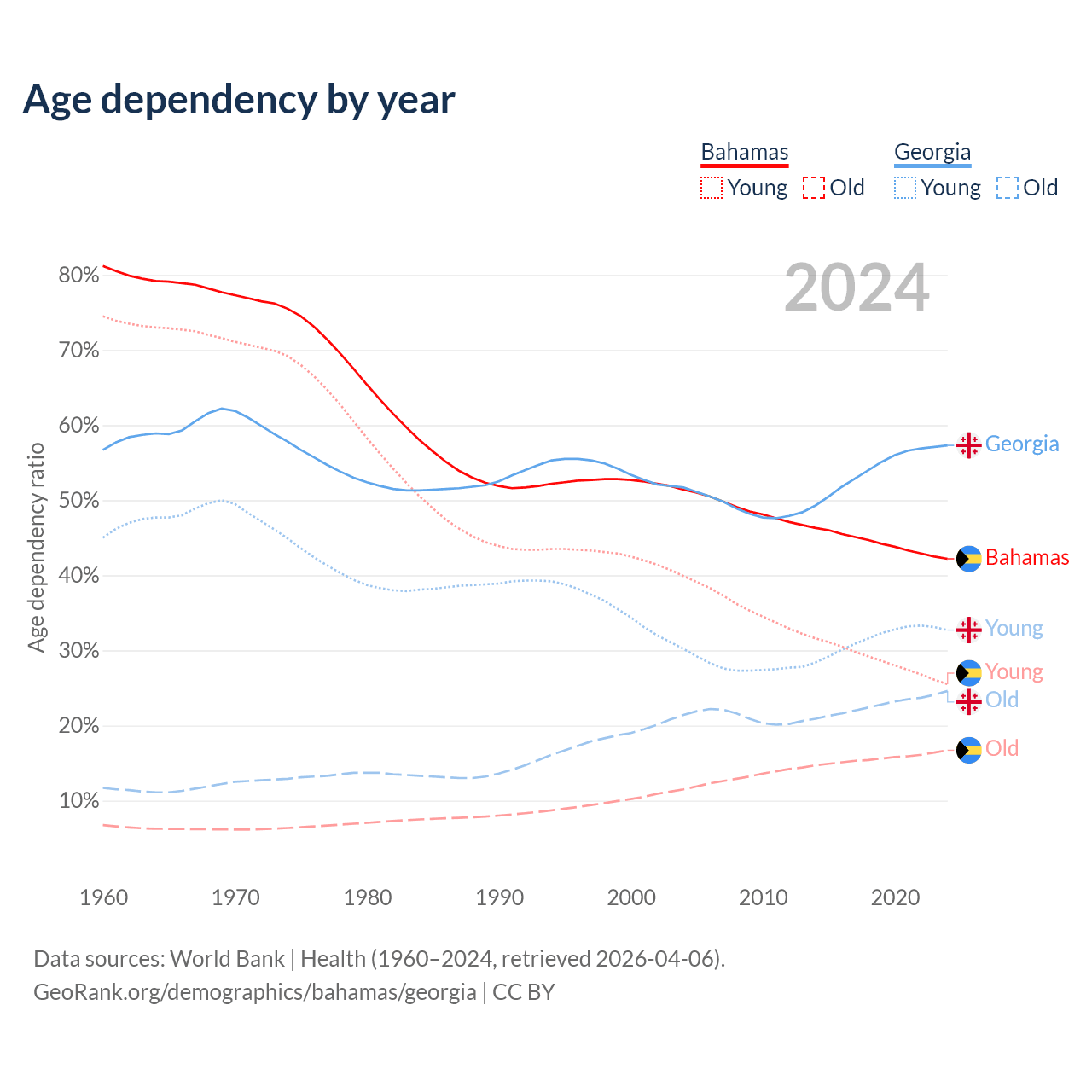 - The share of old-age demographic (65+) in the Bahamas is 11.8% vs 15.6% in Georgia.