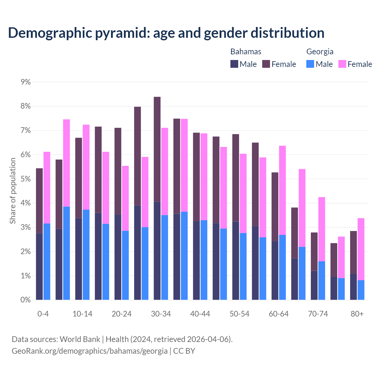 - The share of young demographic (0-15 years old) in the Bahamas is 17.9% vs 20.8% in Georgia.