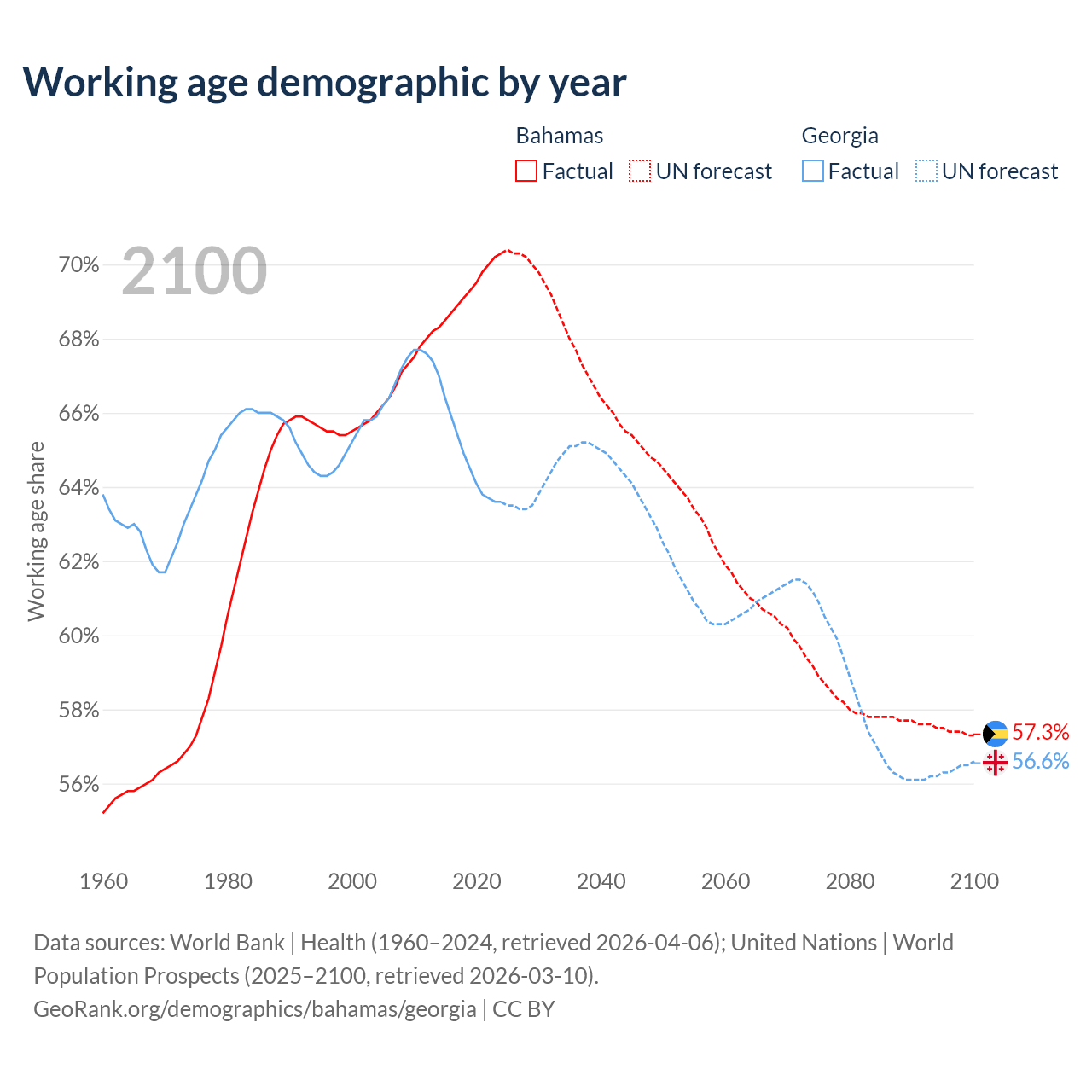 Median age Bahamas vs Georgia, 1960-2100