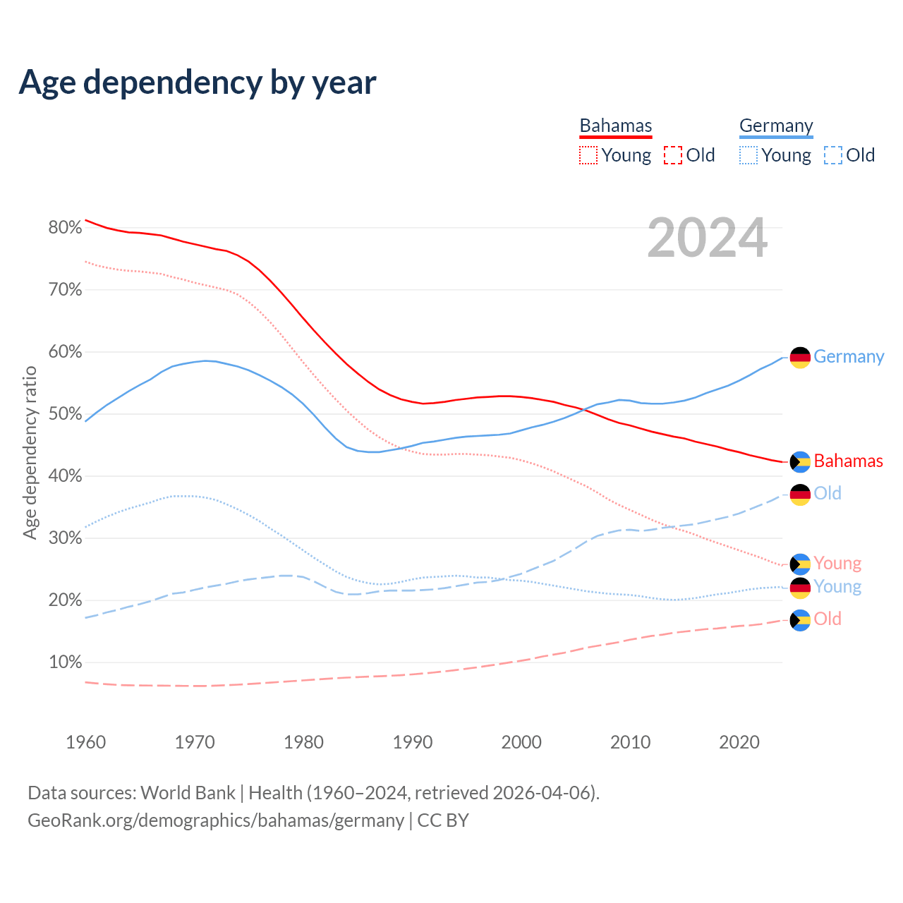 - The share of old-age demographic (65+) in the Bahamas is 11.8% vs 23.2% in Germany.