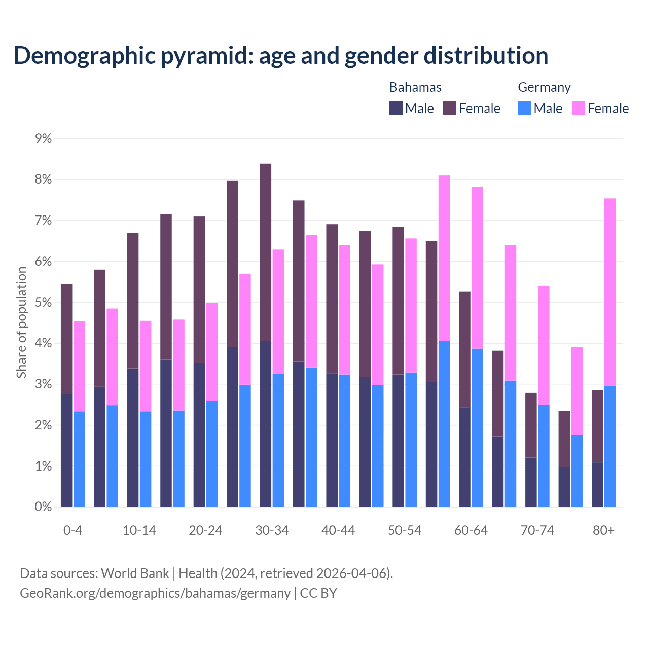 - The Bahamas is ranked 70/196 by median age (oldest to youngest) vs 9/196 for Germany.