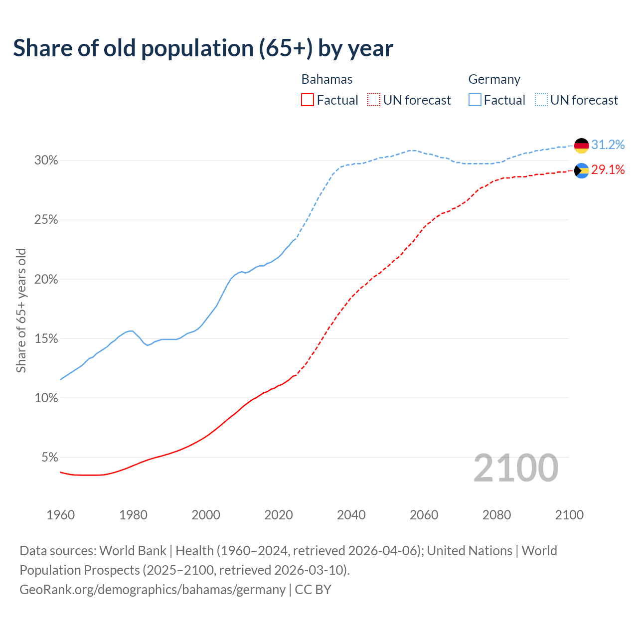 The share of older people aged 65 and over is 11.8% in the Bahamas and 23.2% in Germany. Life expectancy in the Bahamas compared to Germany .