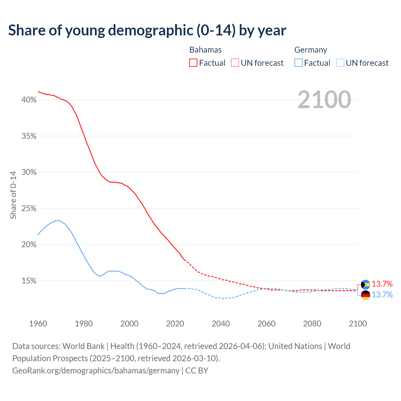 - The share of young demographic (0-15 years old) in the Bahamas is 17.9% vs 13.9% in Germany.