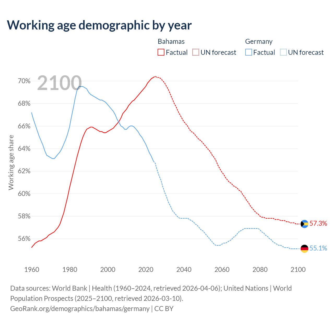 - The Bahamas has 285K working age adults (aged 15-64) vs 51.9M in Germany.