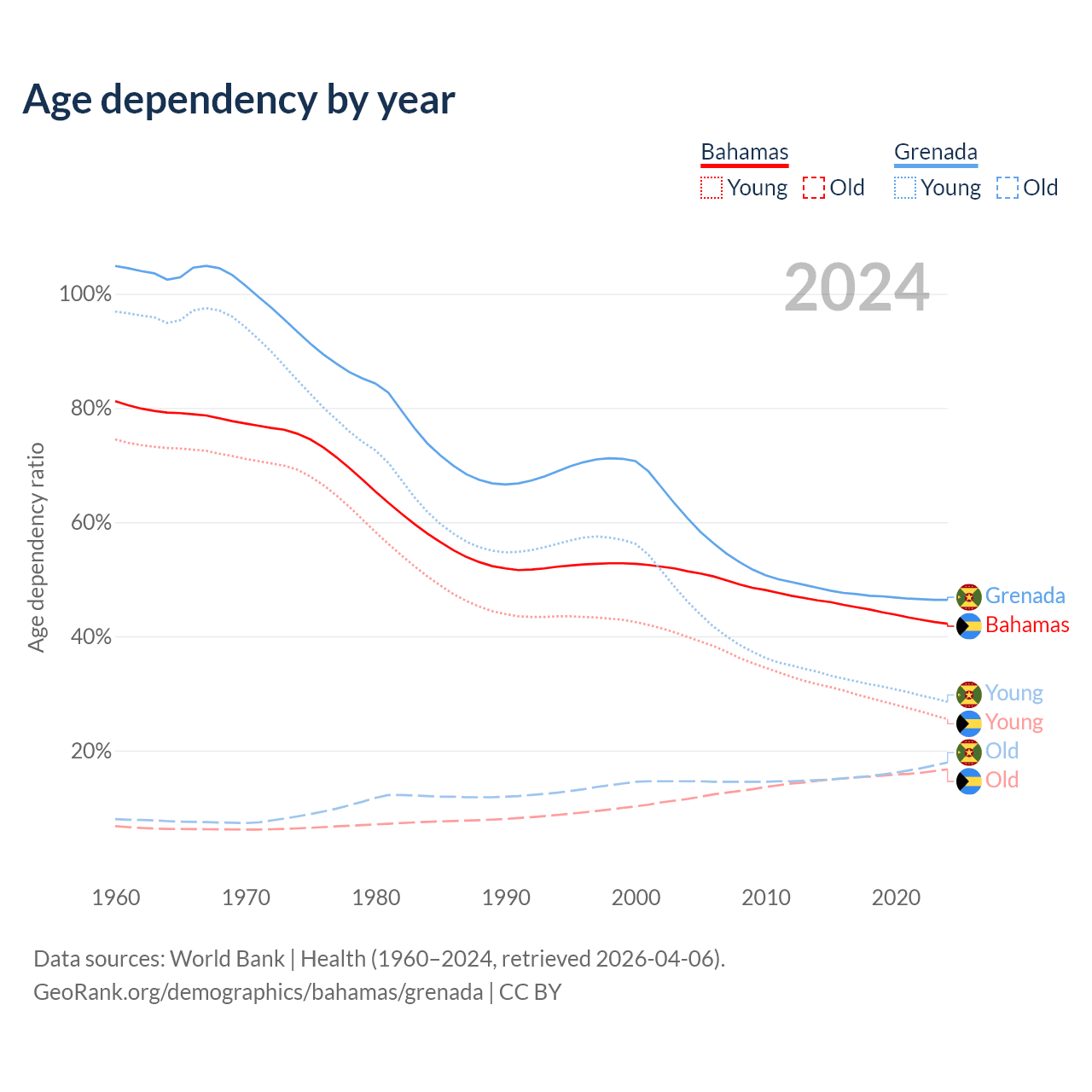 The share of older people aged 65 and over is 11.8% in the Bahamas and 12.2% in Grenada. Life expectancy in the Bahamas compared to Grenada .