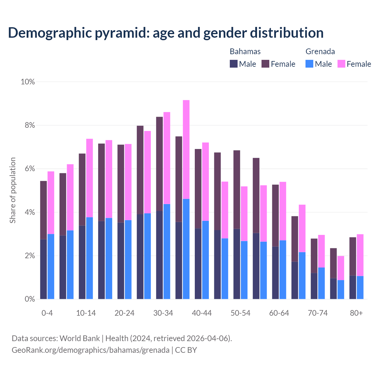 - As of 2026, the population of the Bahamas is 405K vs 117K in Grenada - 3.45 times difference.