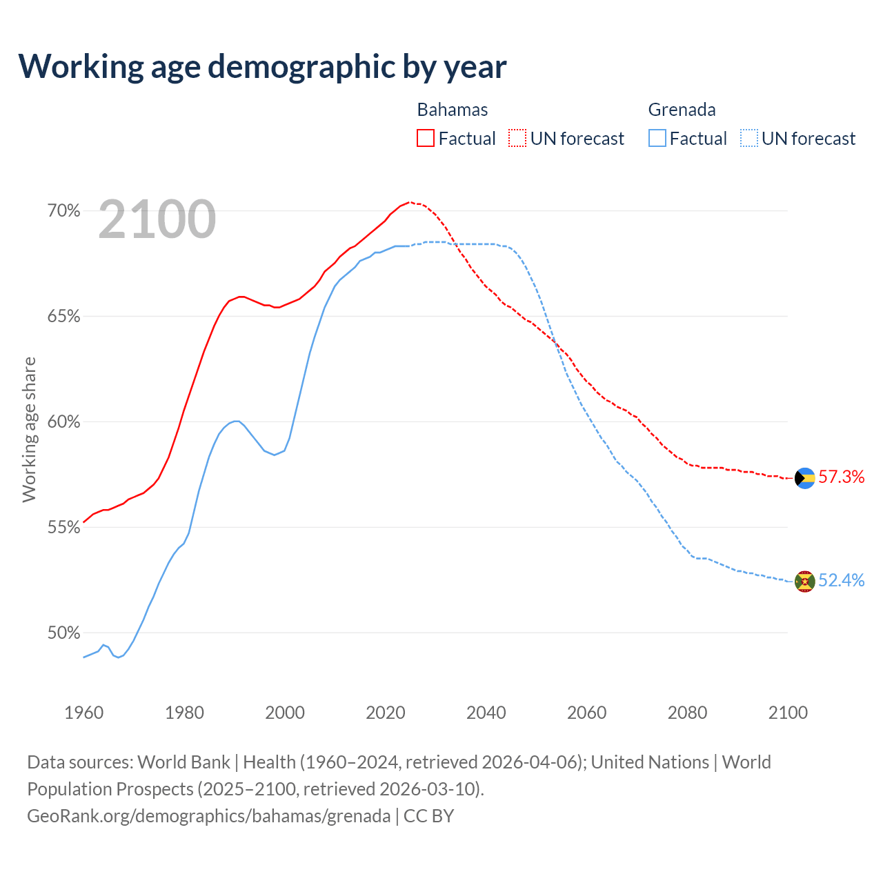 - The Bahamas has 285K working age adults (aged 15-64) vs 80.2K in Grenada.