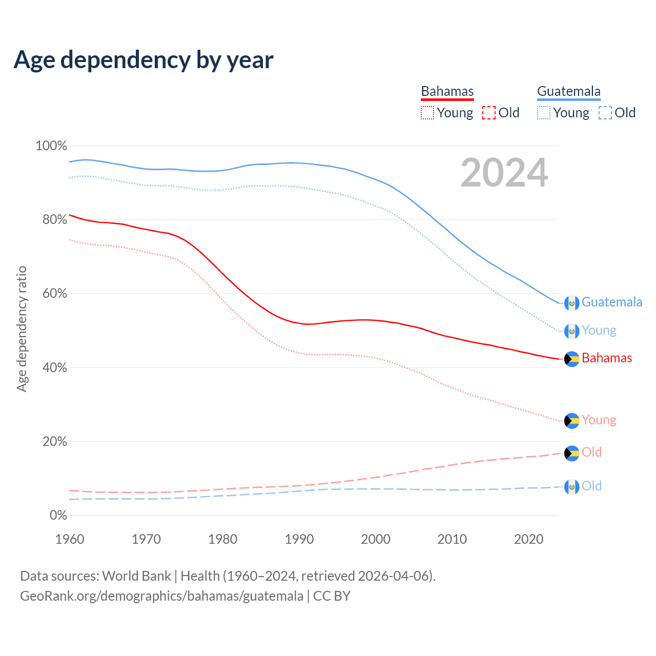 - The Bahamas is ranked 70/196 by median age (oldest to youngest) vs 137/196 for Guatemala.