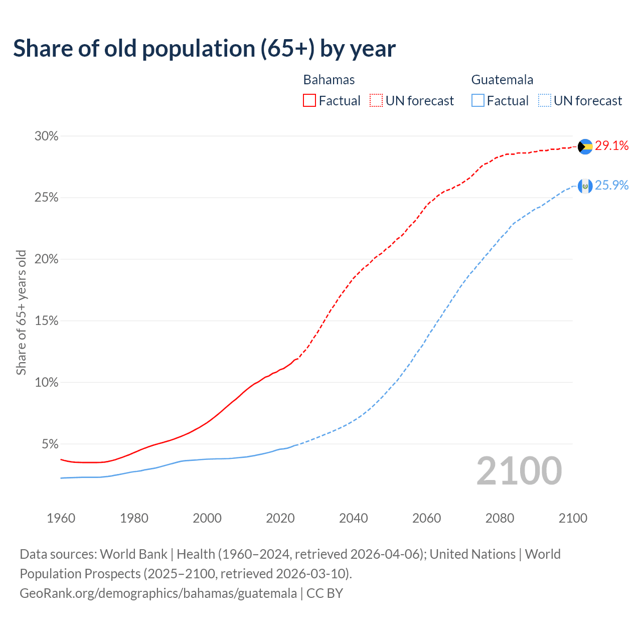 - The share of old-age demographic (65+) in the Bahamas is 11.8% vs 4.85% in Guatemala.