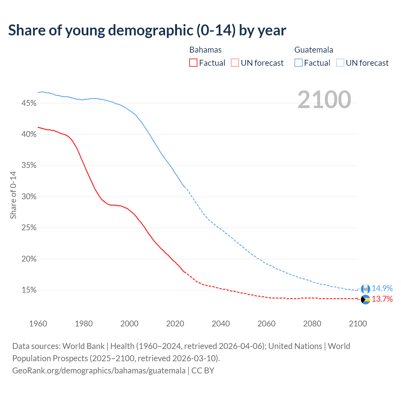 - The share of young demographic (0-15 years old) in the Bahamas is 17.9% vs 31.6% in Guatemala.