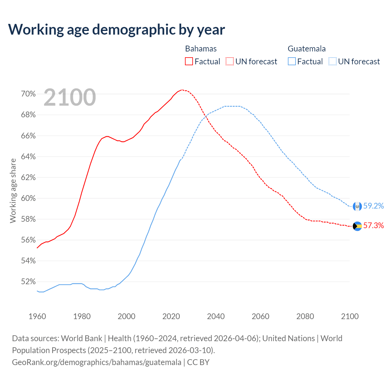- The Bahamas has 285K working age adults (aged 15-64) vs 12.1M in Guatemala.