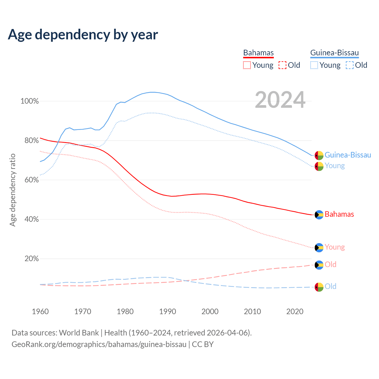 - The share of old-age demographic (65+) in the Bahamas is 11.8% vs 3.19% in Guinea-Bissau.