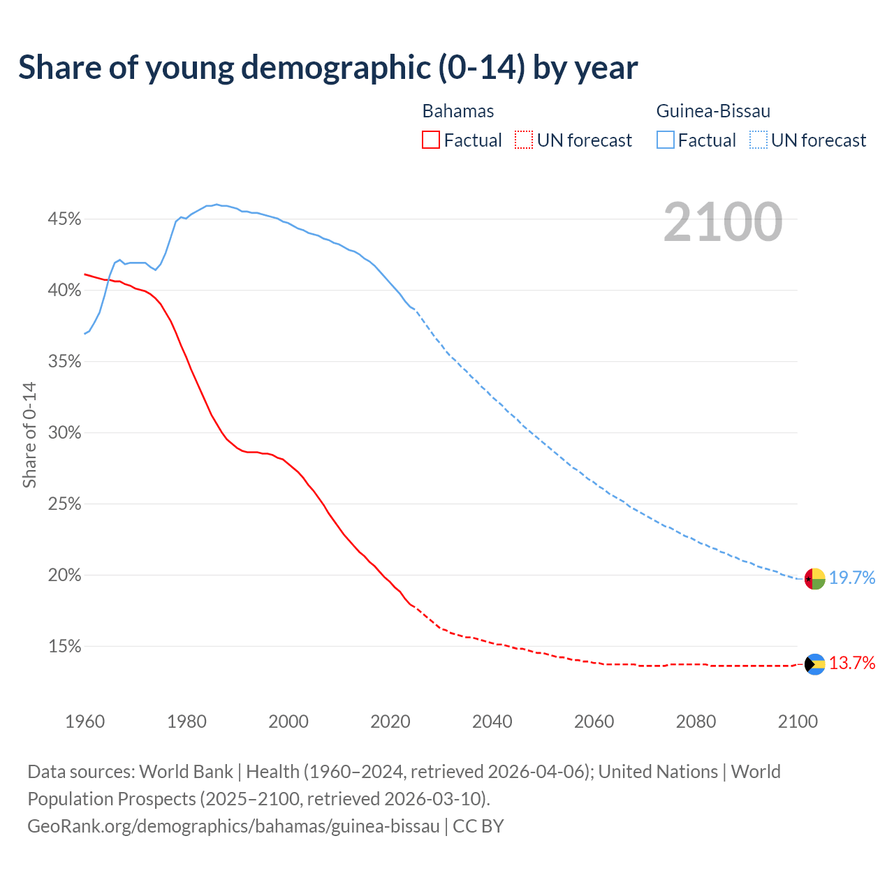 - The share of young demographic (0-15 years old) in the Bahamas is 17.9% vs 38.8% in Guinea-Bissau.