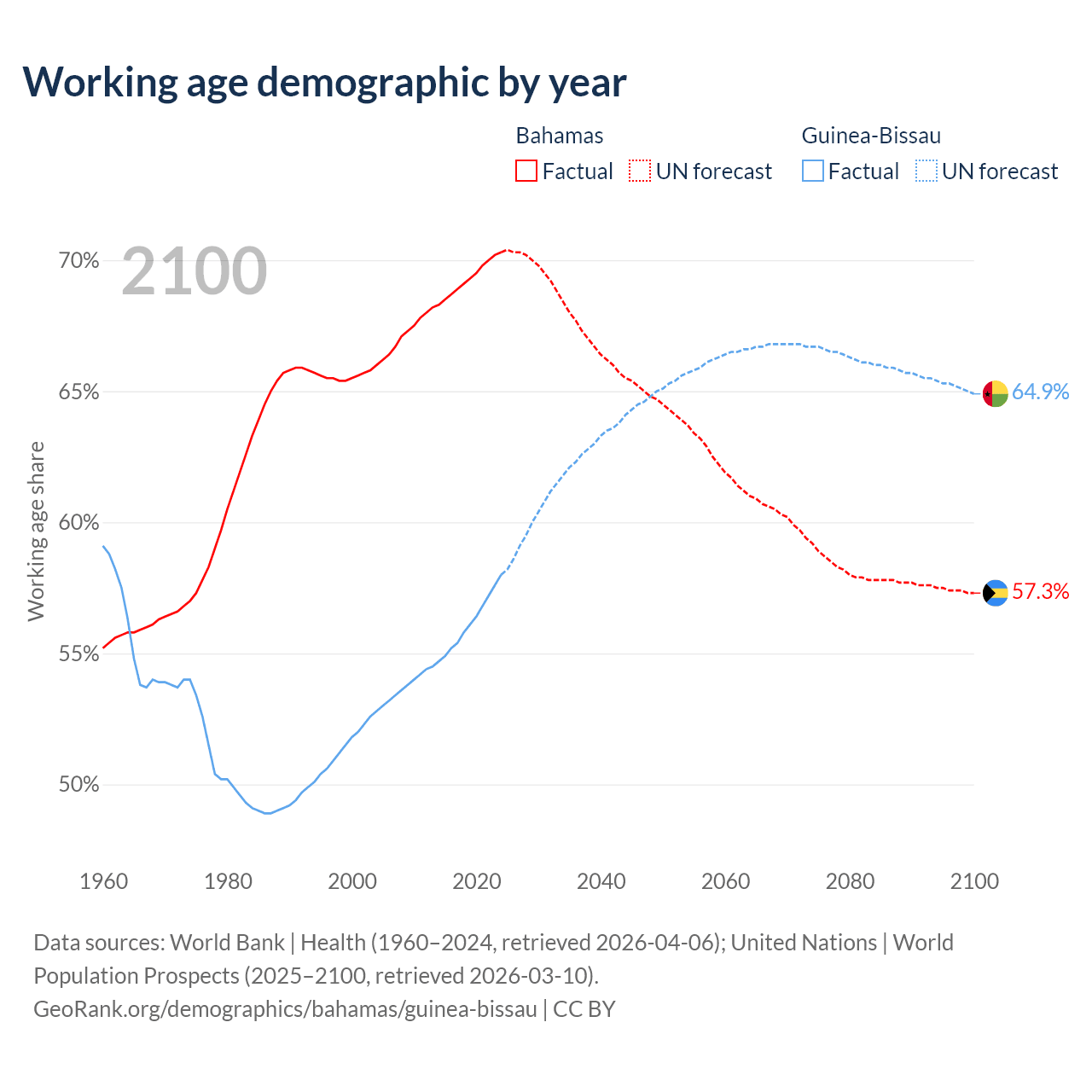 - The Bahamas has 285K working age adults (aged 15-64) vs 1.34M in Guinea-Bissau.