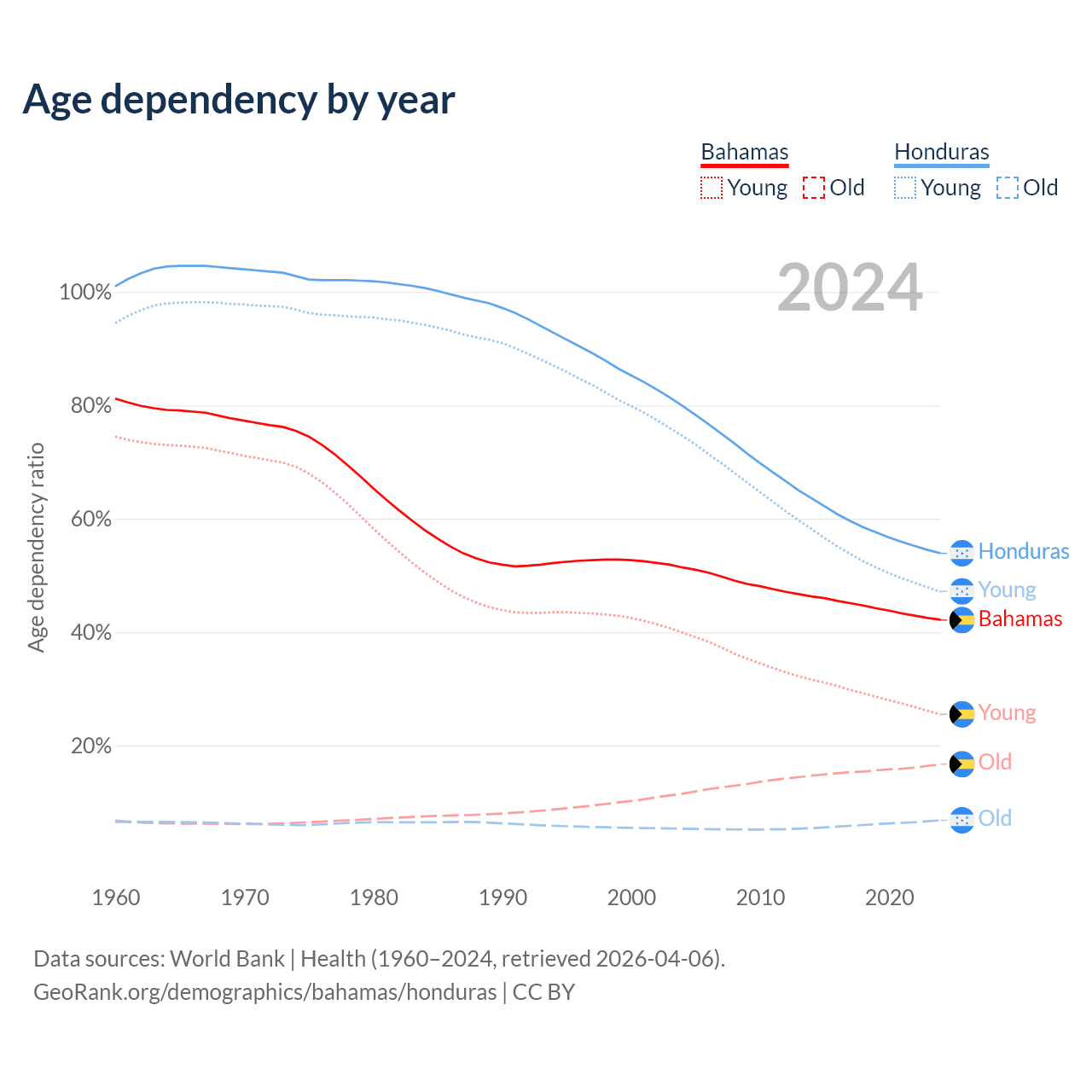 Data sources: World Bank | Health (1960–2024, retrieved 2026-04-06); U.S. Census Bureau (1960–2024, retrieved 2026-02-08).