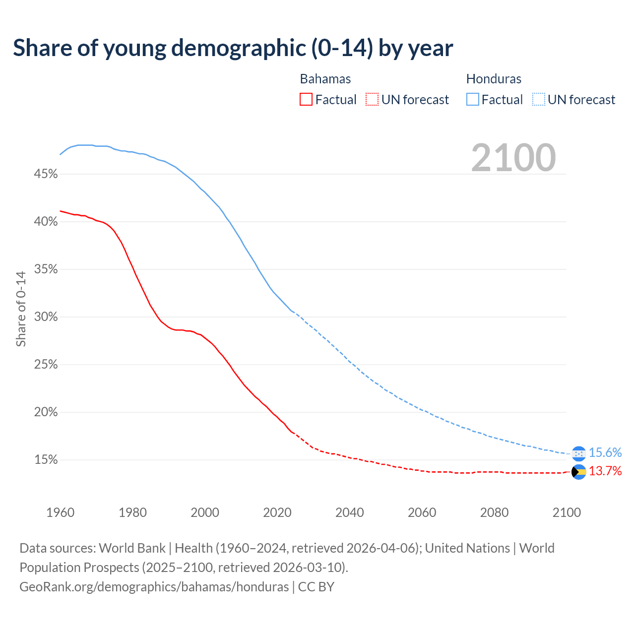 - The share of young demographic (0-15 years old) in the Bahamas is 17.9% vs 30.6% in Honduras.