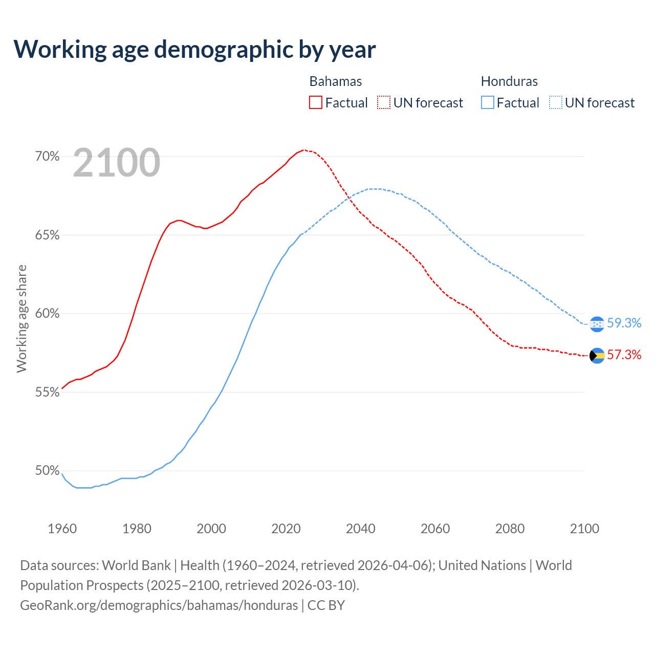 Median age Bahamas vs Honduras, 1960-2100