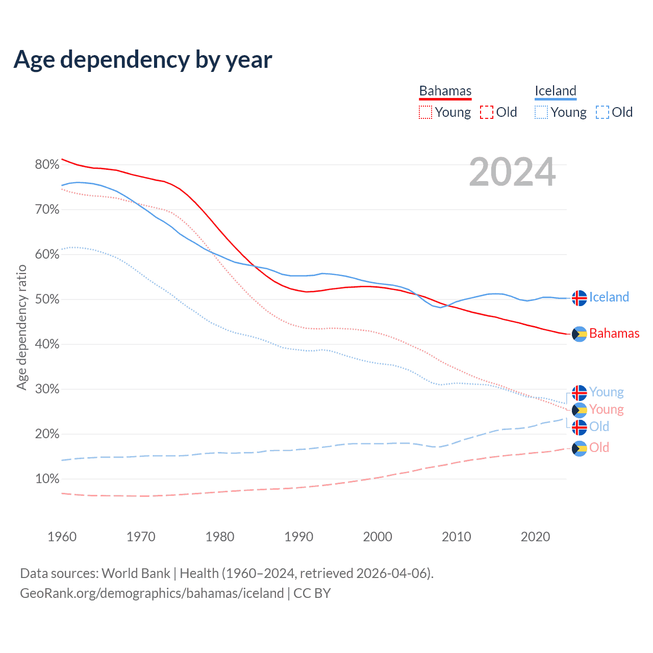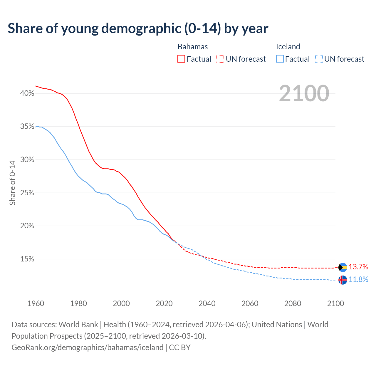 - The share of young demographic (0-15 years old) in the Bahamas is 17.9% vs 17.8% in Iceland.