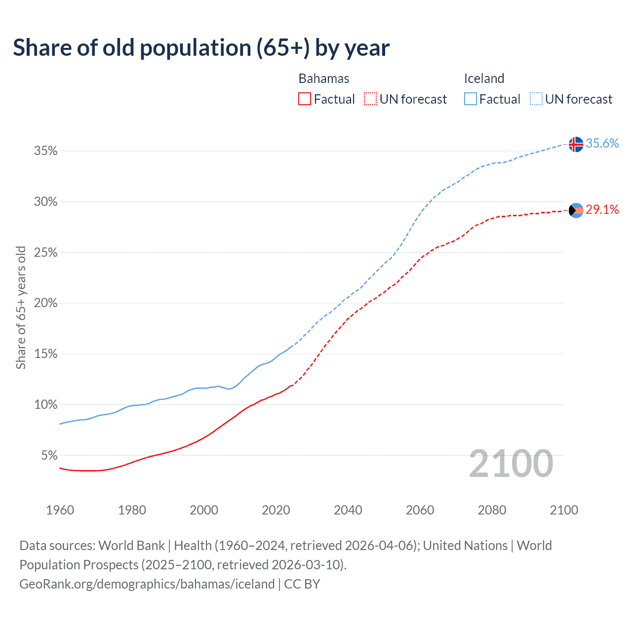 The share of older people aged 65 and over is 11.8% in the Bahamas and 15.6% in Iceland. Life expectancy in the Bahamas compared to Iceland .