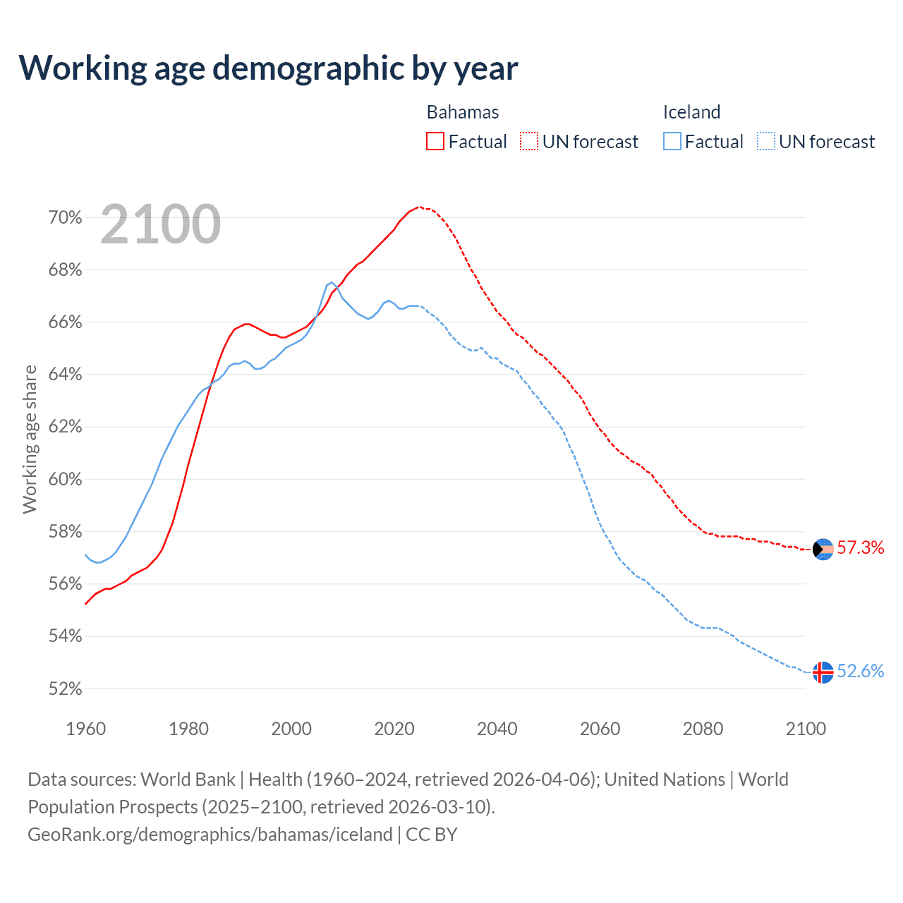 - The Bahamas has 285K working age adults (aged 15-64) vs 264K in Iceland.