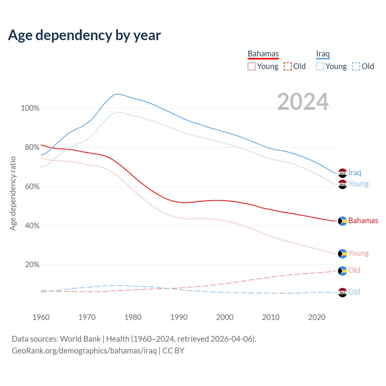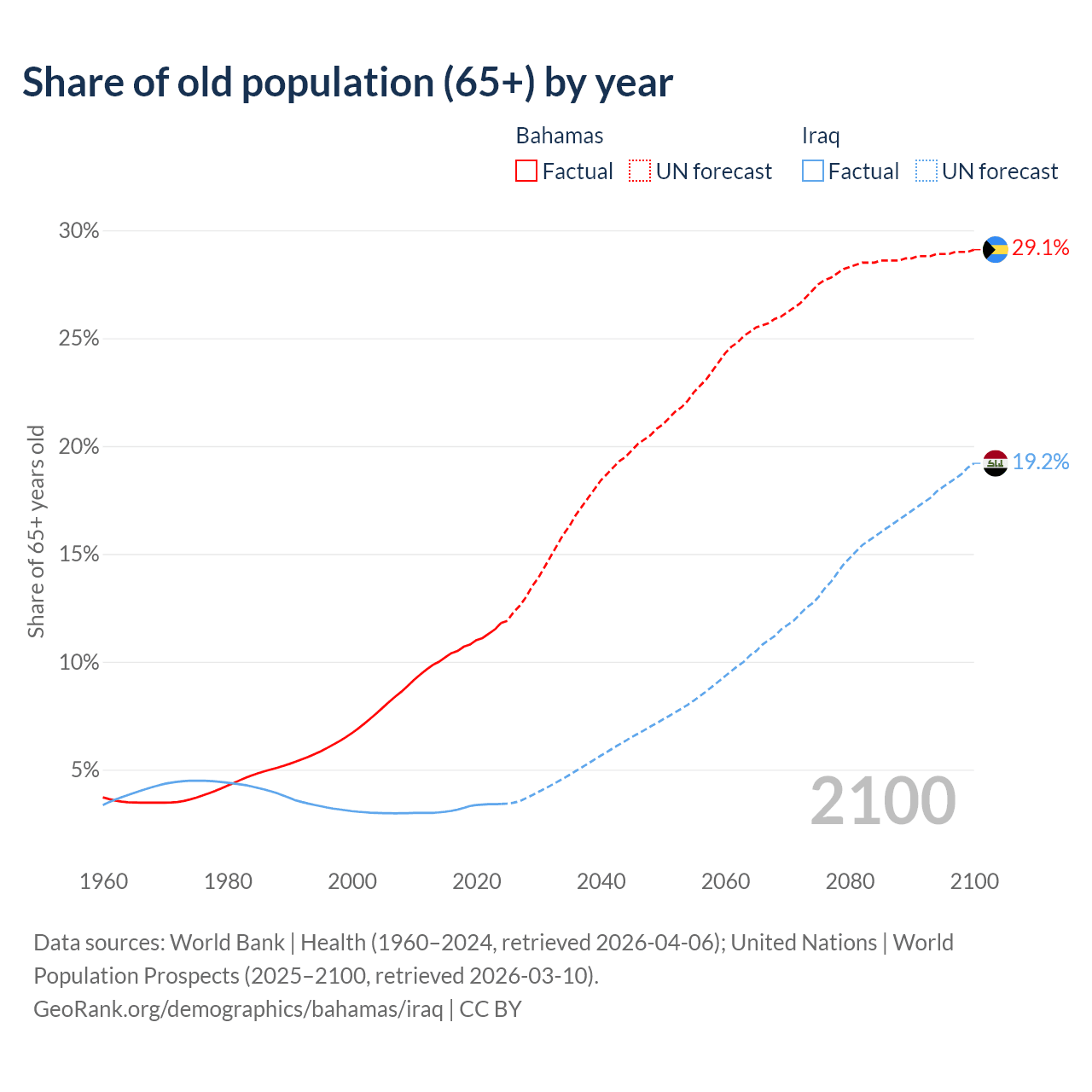 - The share of old-age demographic (65+) in the Bahamas is 11.8% vs 3.41% in Iraq.