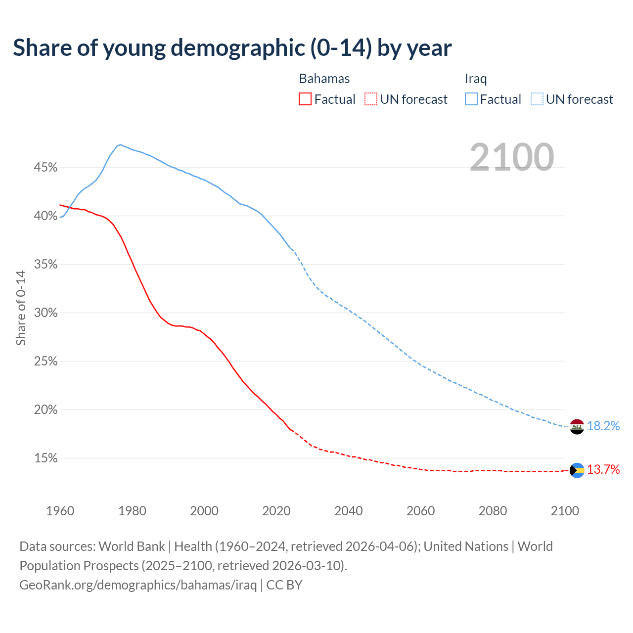 - The share of young demographic (0-15 years old) in the Bahamas is 17.9% vs 36.6% in Iraq.