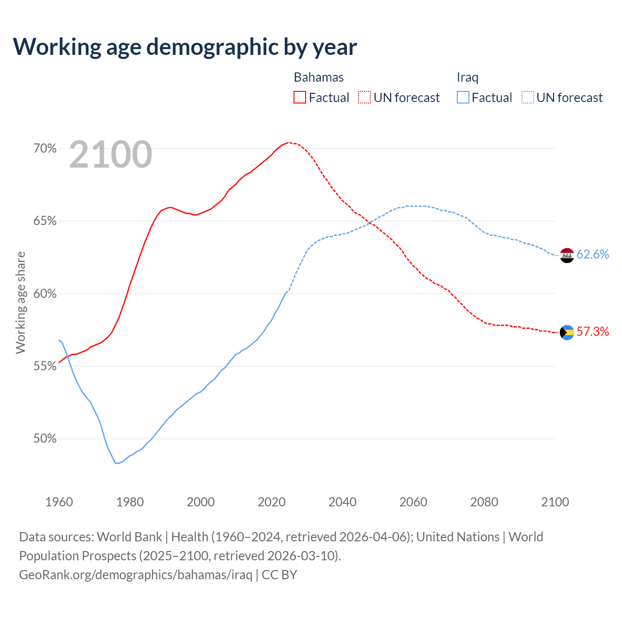 Median age Bahamas vs Iraq, 1960-2100