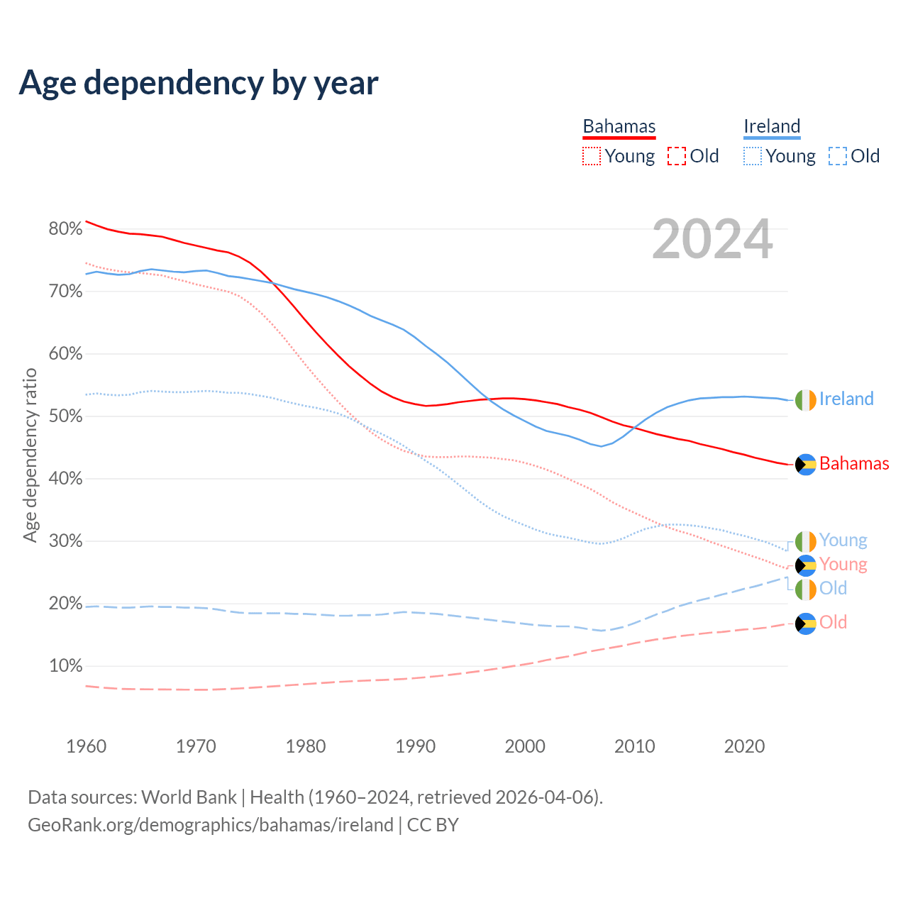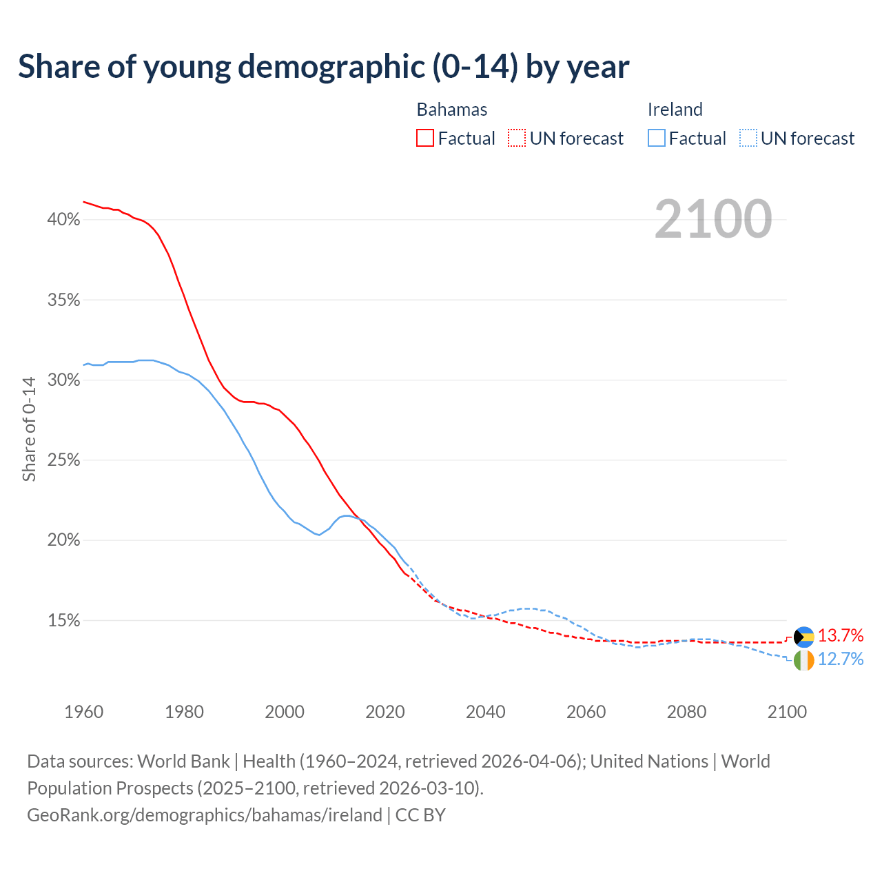 - The share of young demographic (0-15 years old) in the Bahamas is 17.9% vs 18.6% in Ireland.