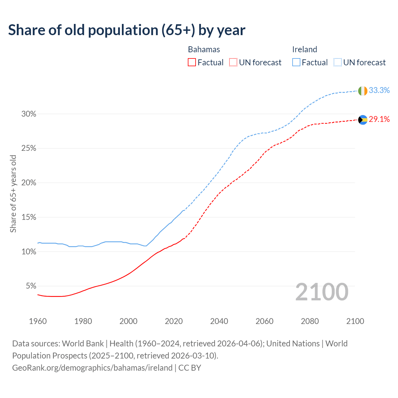 - The share of old-age demographic (65+) in the Bahamas is 11.8% vs 15.9% in Ireland.