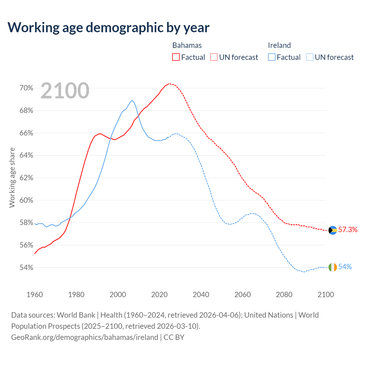 - The Bahamas has 285K working age adults (aged 15-64) vs 3.62M in Ireland.