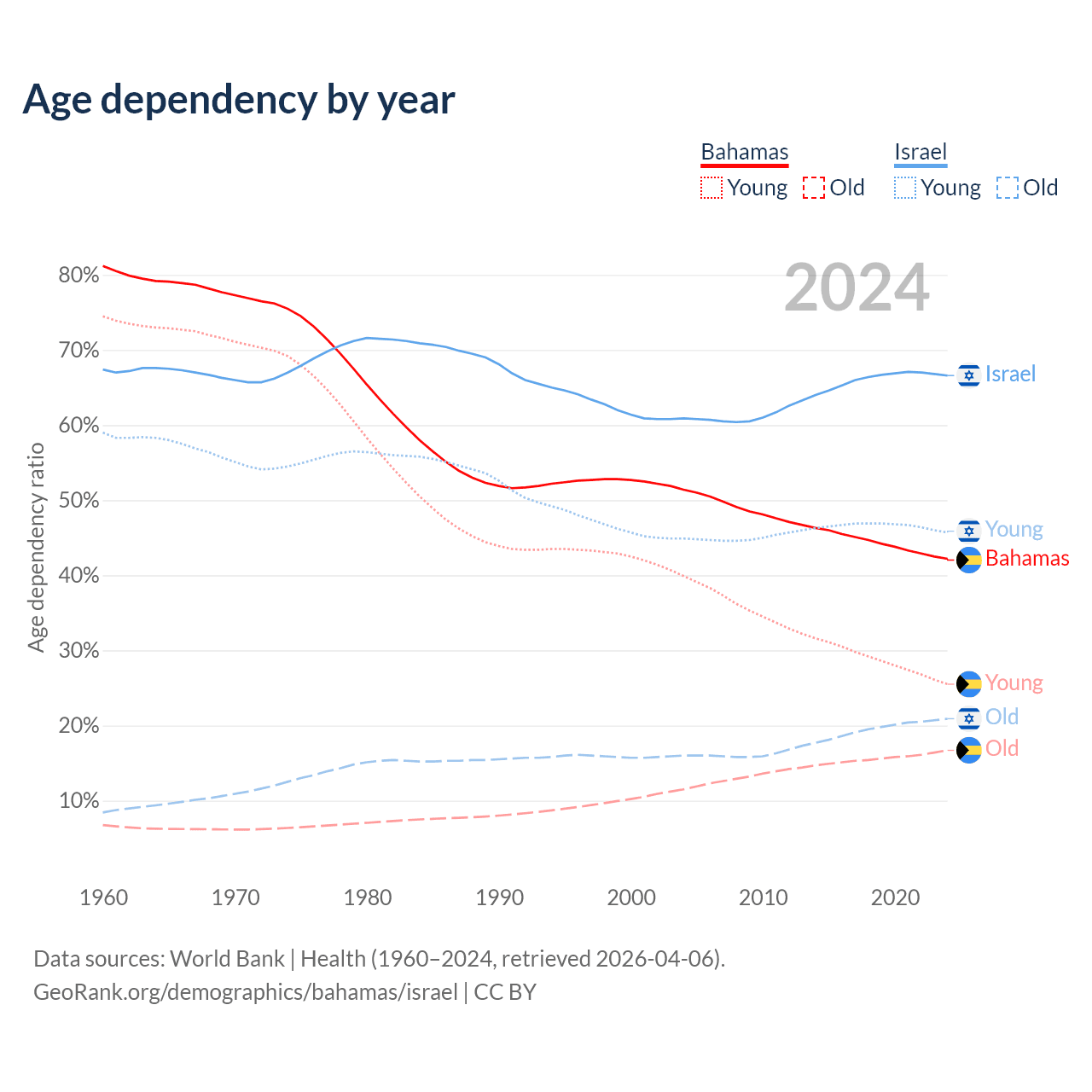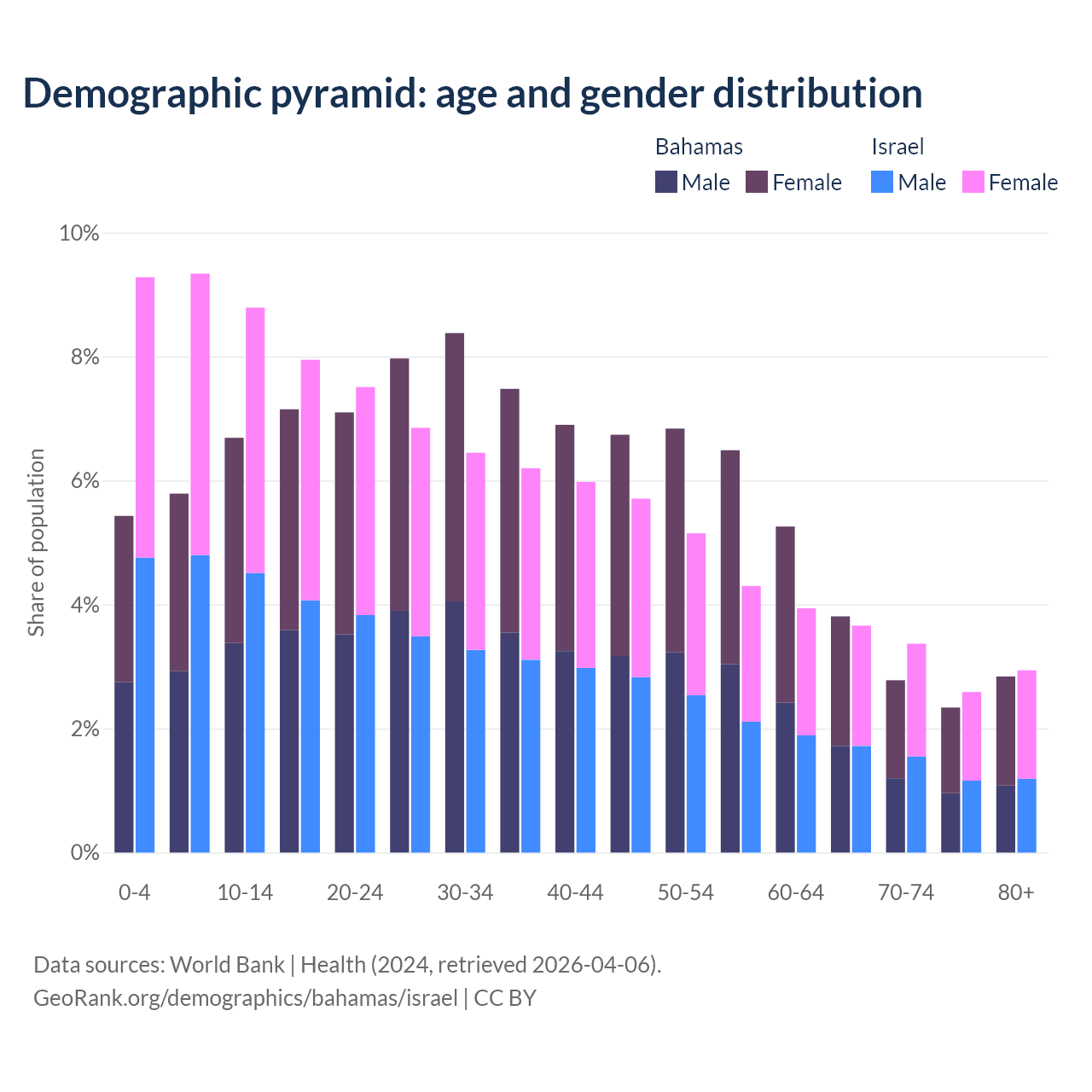 - The Bahamas is ranked 70/196 by median age (oldest to youngest) vs 103/196 for Israel.