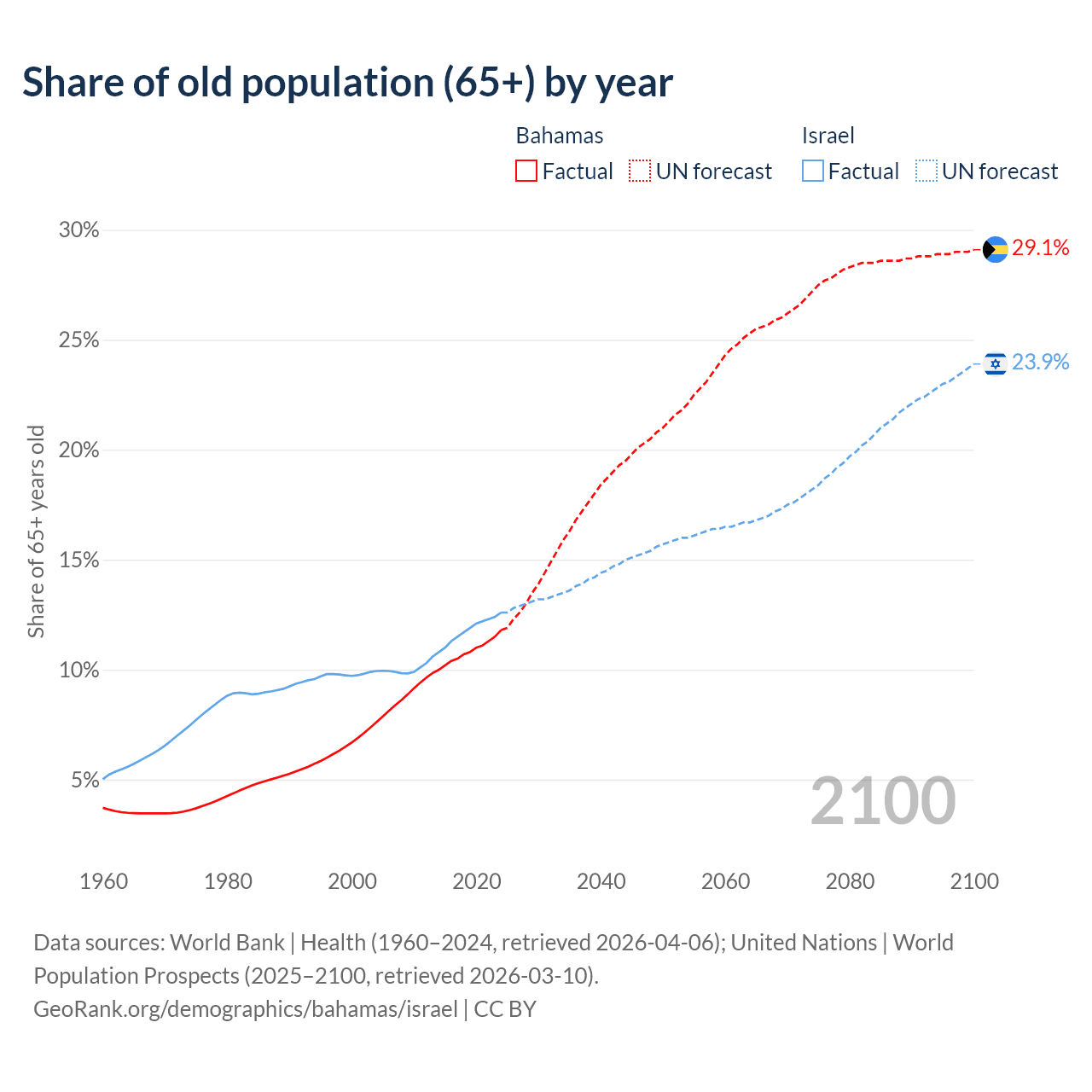 The share of older people aged 65 and over is 11.8% in the Bahamas and 12.6% in Israel. Life expectancy in the Bahamas compared to Israel .