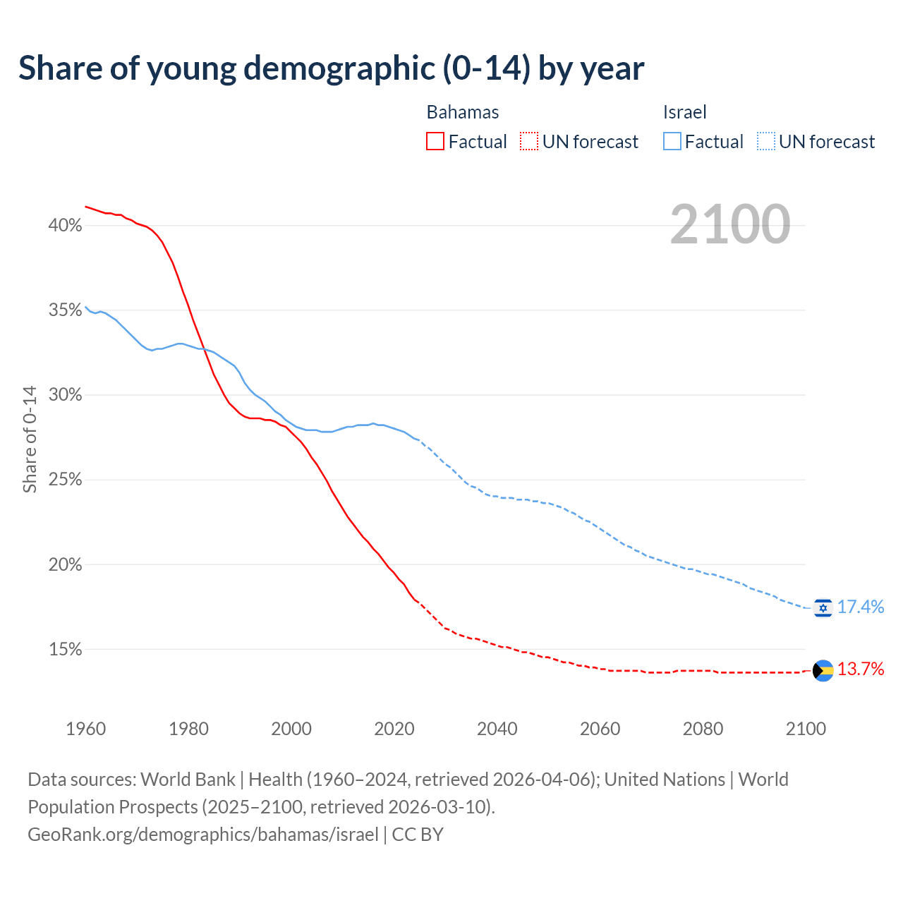 - The share of young demographic (0-15 years old) in the Bahamas is 17.9% vs 27.4% in Israel.