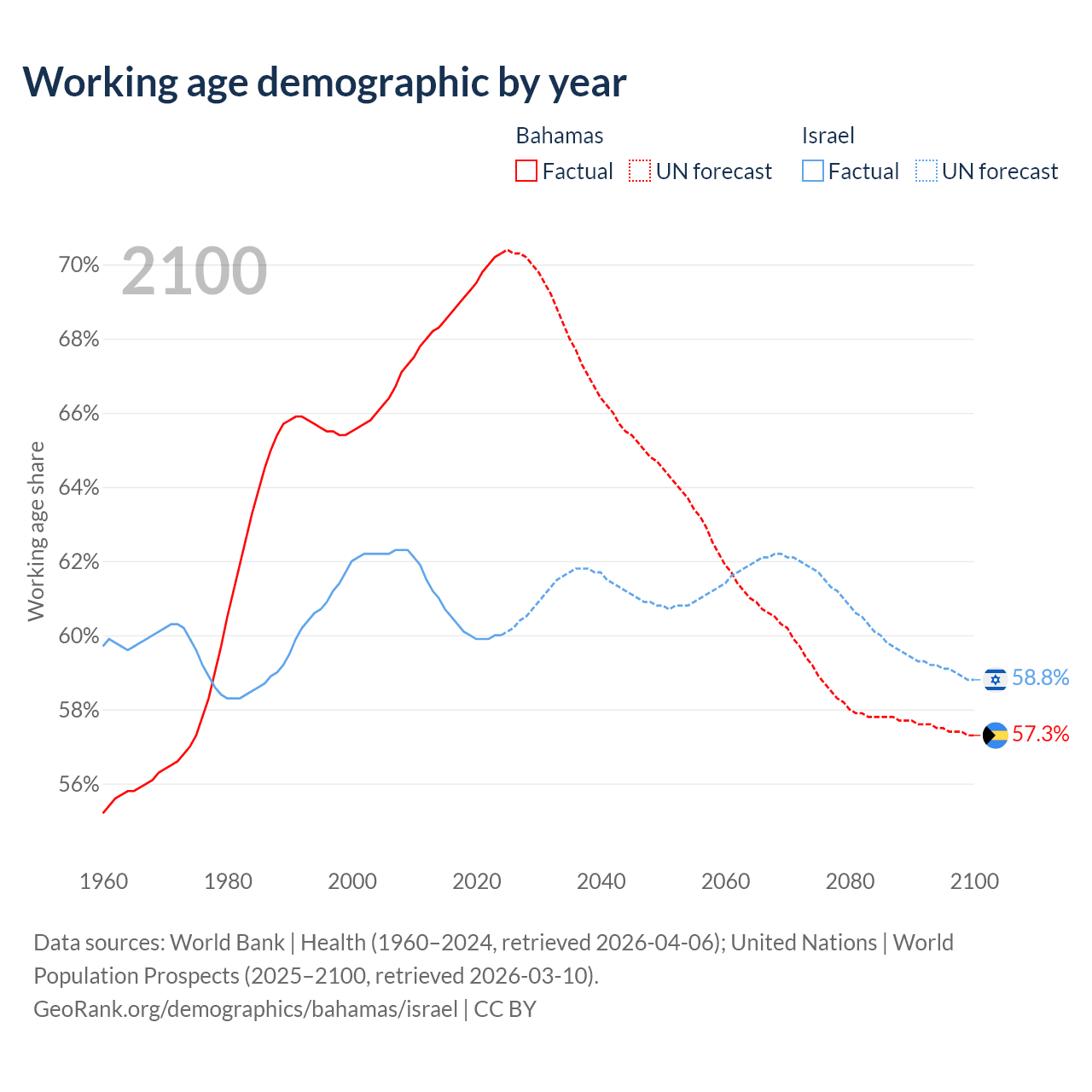 - The Bahamas has 285K working age adults (aged 15-64) vs 6.18M in Israel.