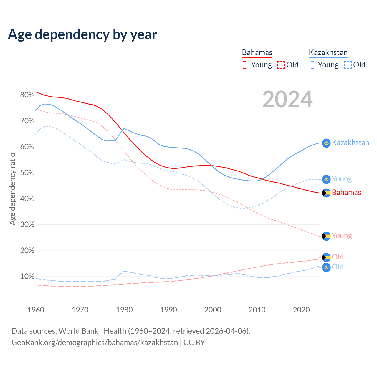 - The Bahamas is ranked 70/196 by median age (oldest to youngest) vs 99/196 for Kazakhstan.