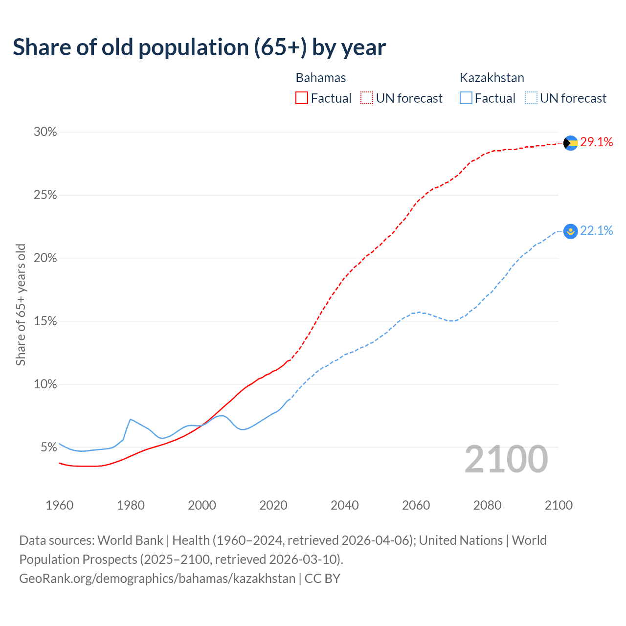 The share of older people aged 65 and over is 11.8% in the Bahamas and 8.65% in Kazakhstan. Life expectancy in the Bahamas compared to Kazakhstan .