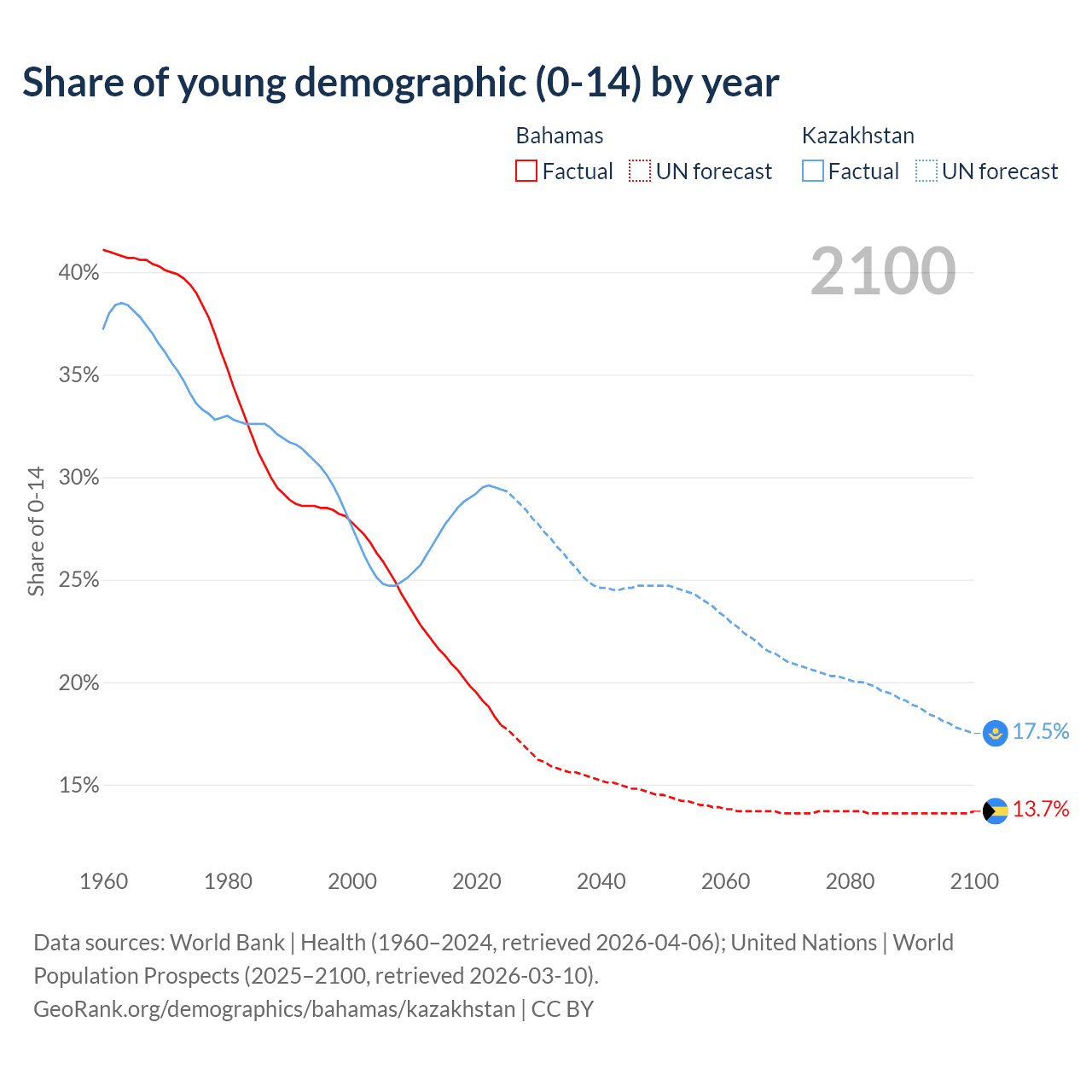 - The share of young demographic (0-15 years old) in the Bahamas is 17.9% vs 29.4% in Kazakhstan.