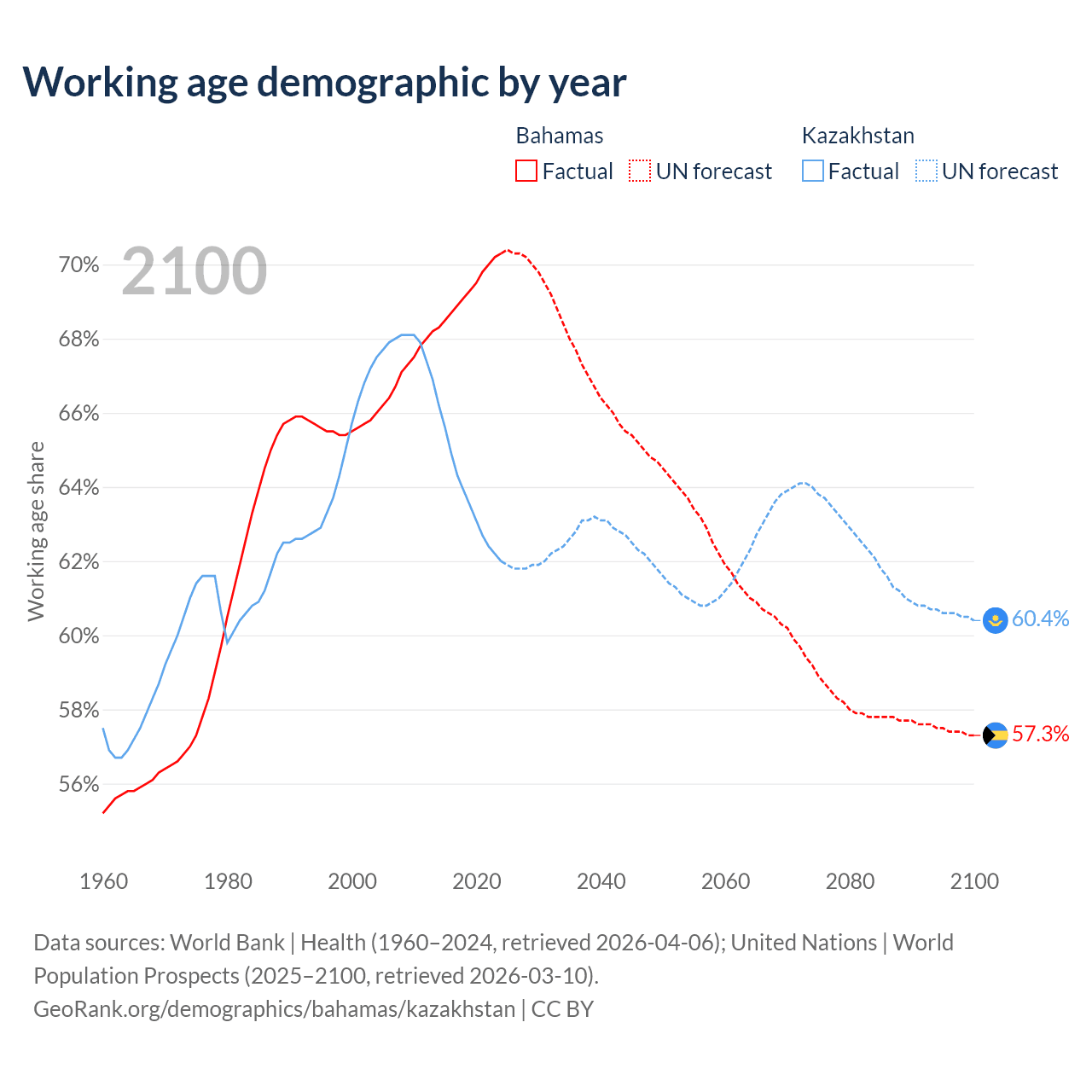 - The Bahamas has 285K working age adults (aged 15-64) vs 13.1M in Kazakhstan.
