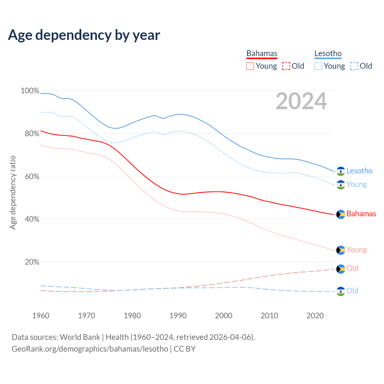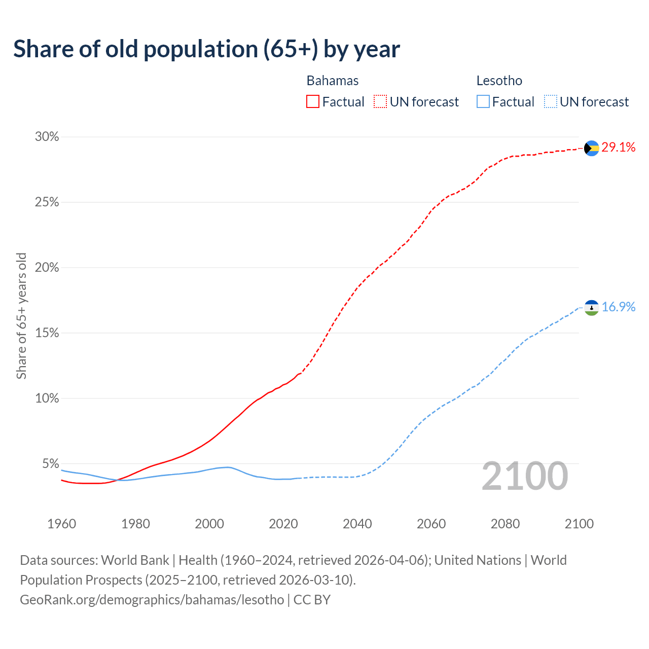 The share of older people aged 65 and over is 11.8% in the Bahamas and 3.86% in Lesotho. Life expectancy in the Bahamas compared to Lesotho .