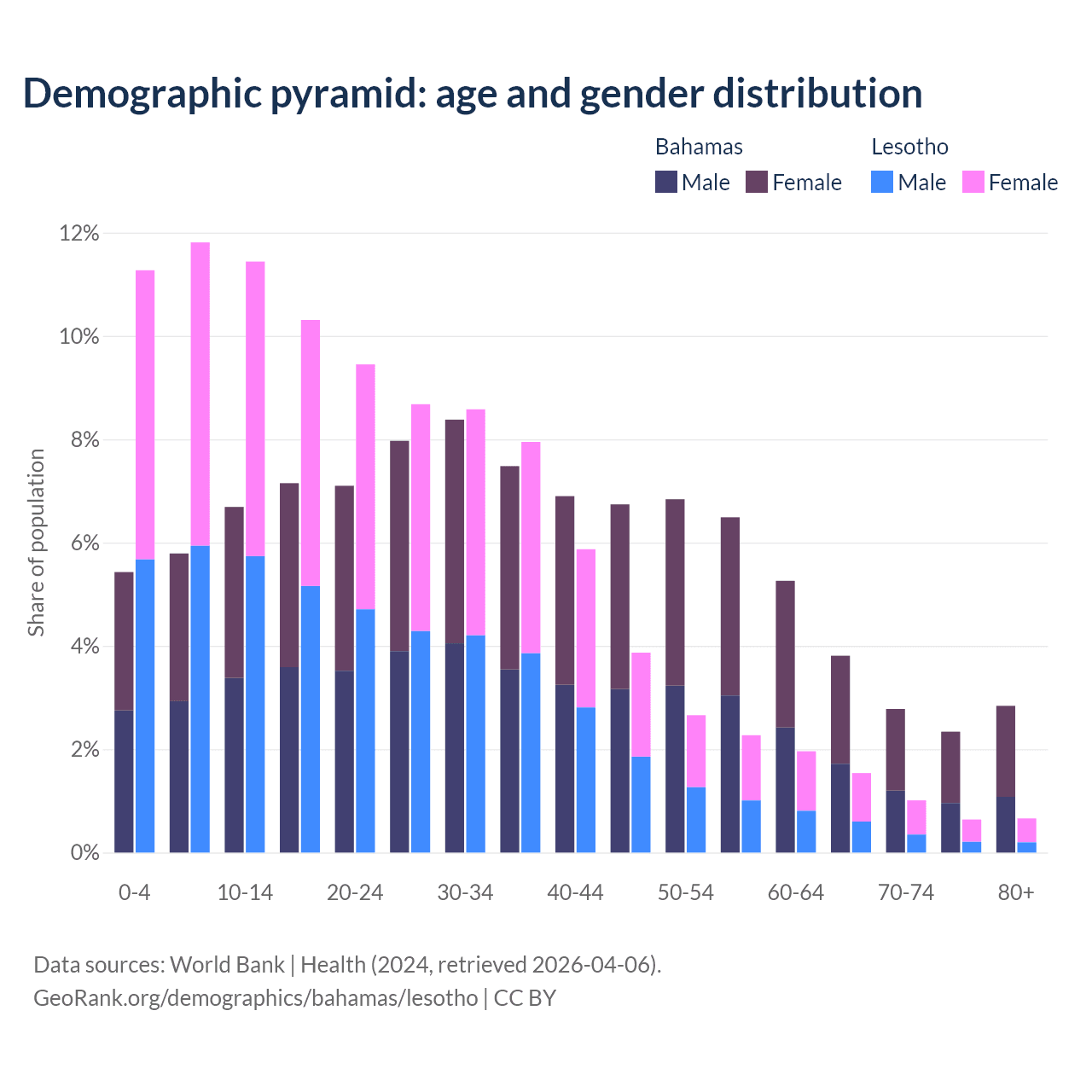 - The Bahamas is ranked 70/196 by median age (oldest to youngest) vs 143/196 for Lesotho.