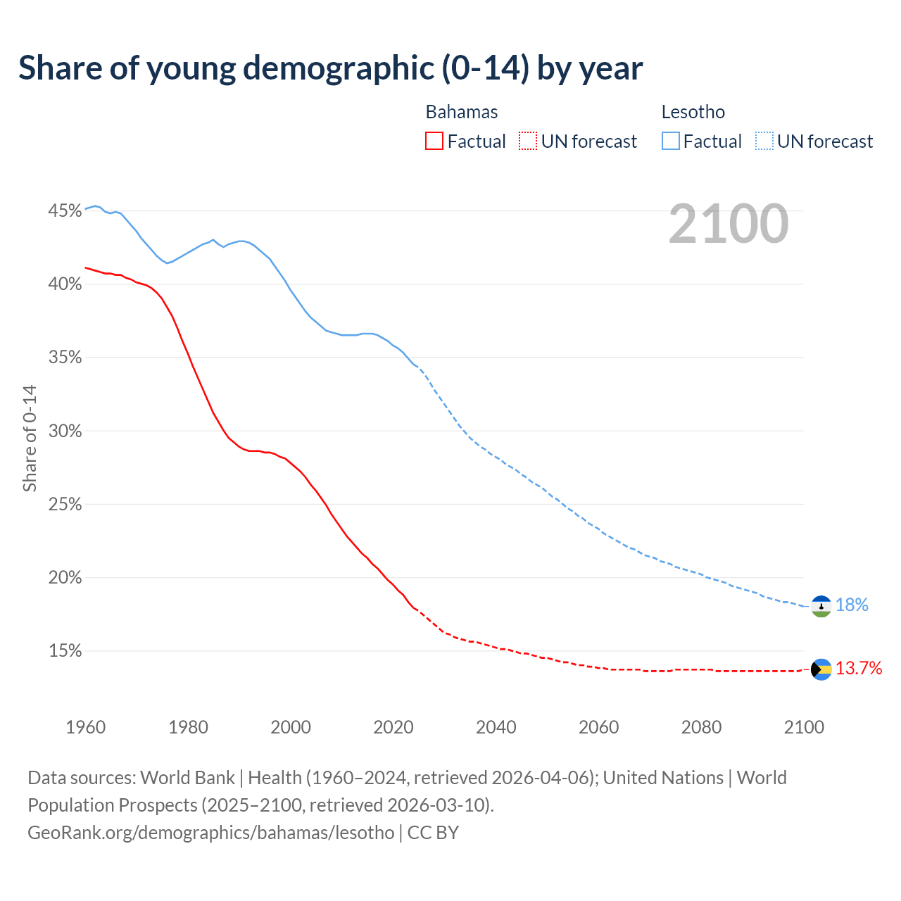 - The share of young demographic (0-15 years old) in the Bahamas is 17.9% vs 34.5% in Lesotho.