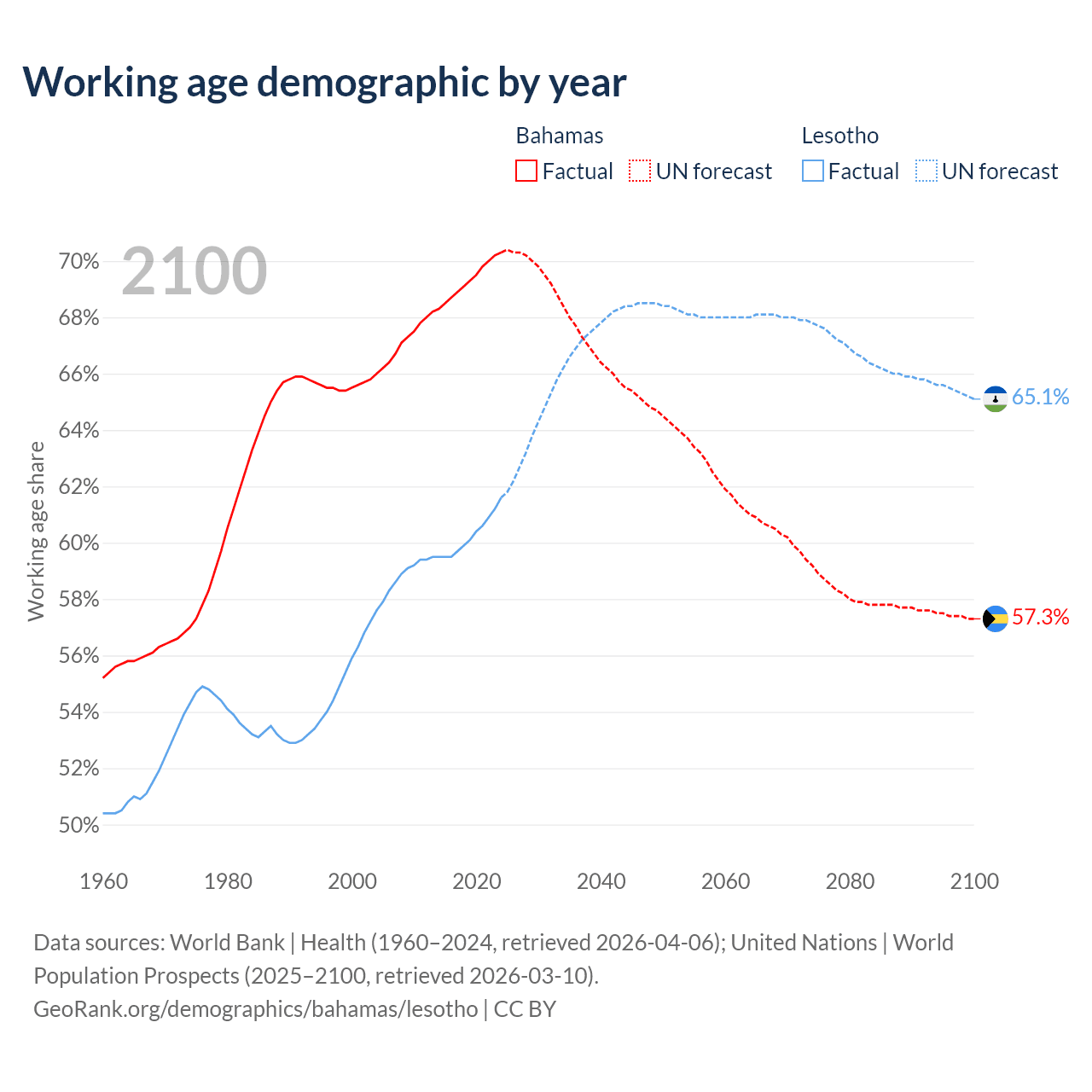 - The Bahamas has 285K working age adults (aged 15-64) vs 1.48M in Lesotho.