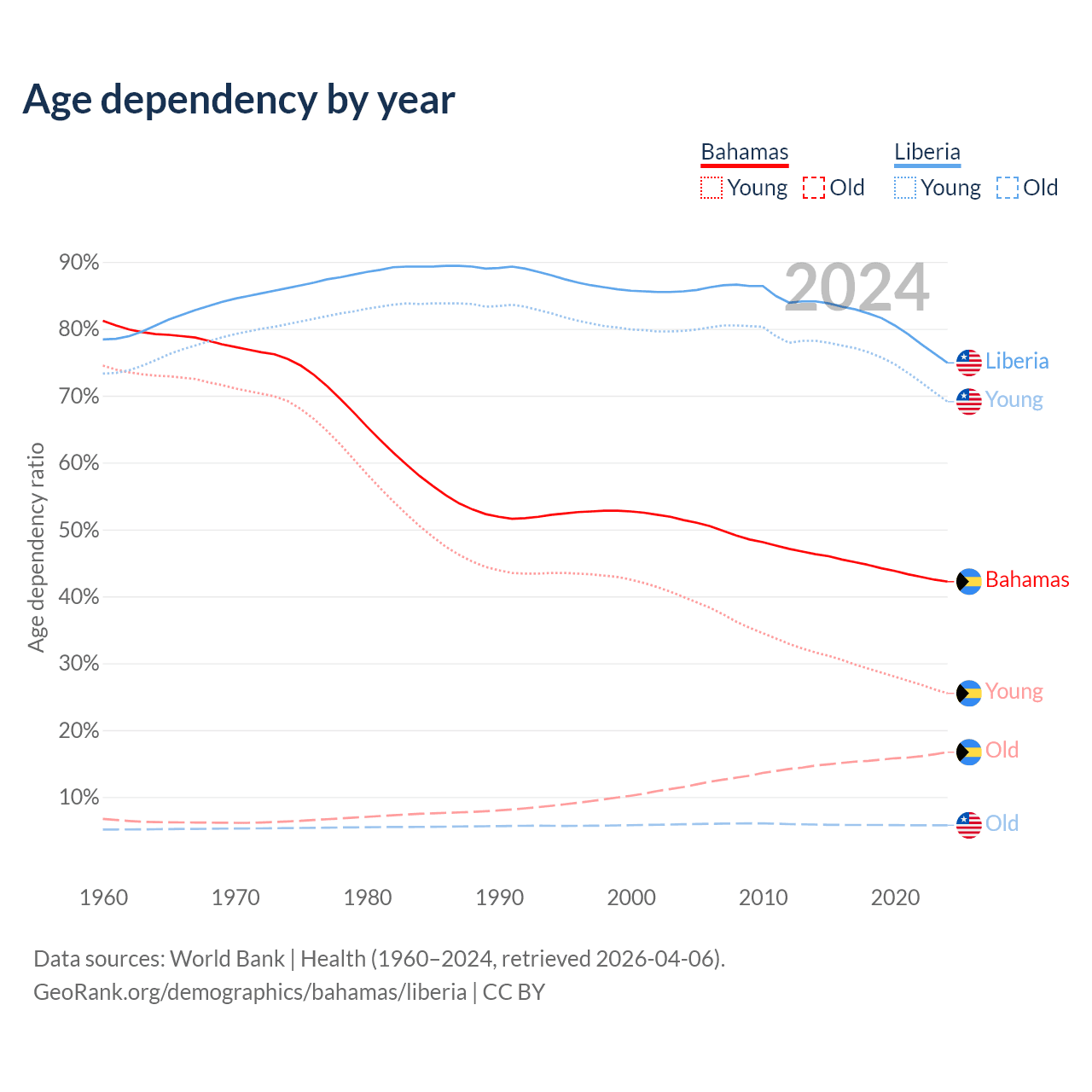 - The share of old-age demographic (65+) in the Bahamas is 11.8% vs 3.3% in Liberia.