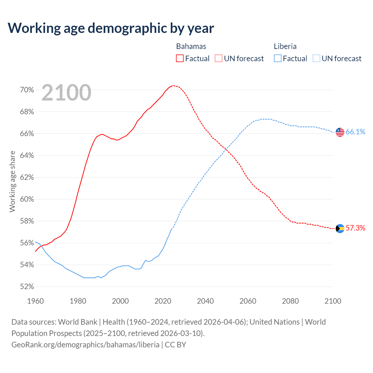 - The Bahamas has 285K working age adults (aged 15-64) vs 3.37M in Liberia.