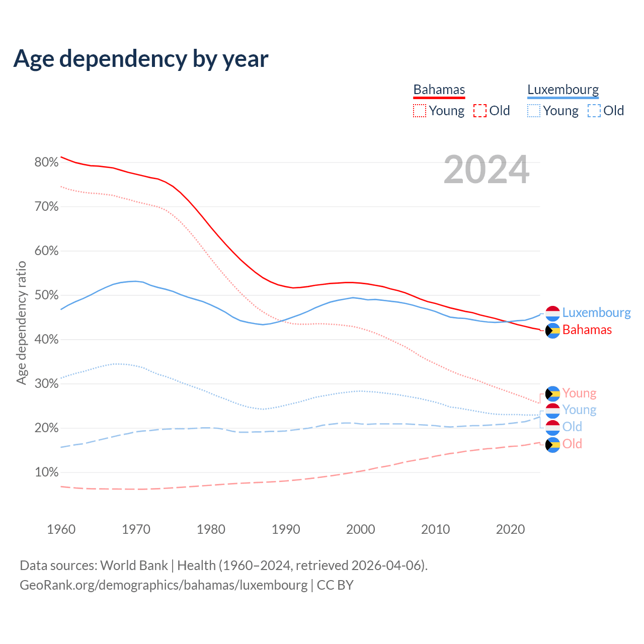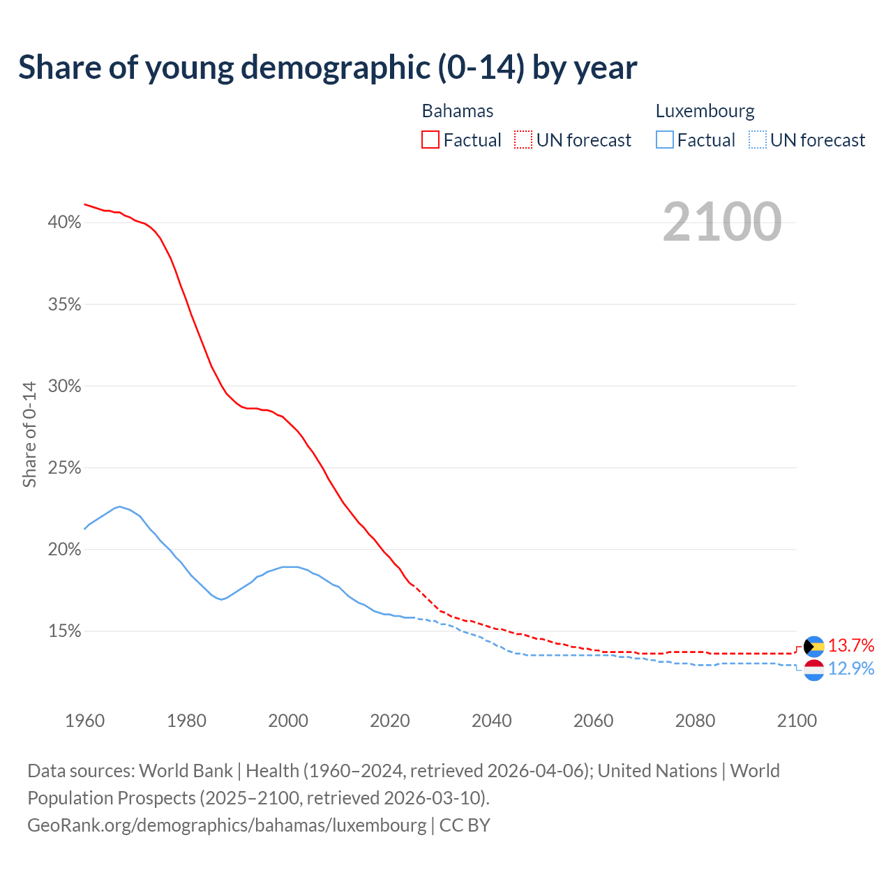 - The share of young demographic (0-15 years old) in the Bahamas is 17.9% vs 15.8% in Luxembourg.