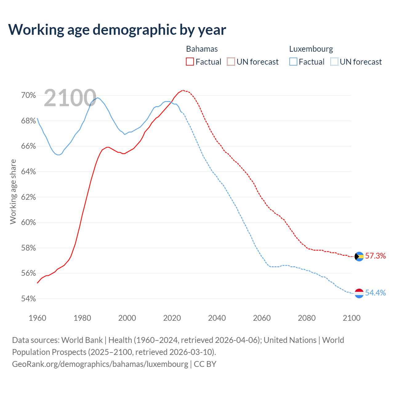 - The Bahamas has 285K working age adults (aged 15-64) vs 477K in Luxembourg.