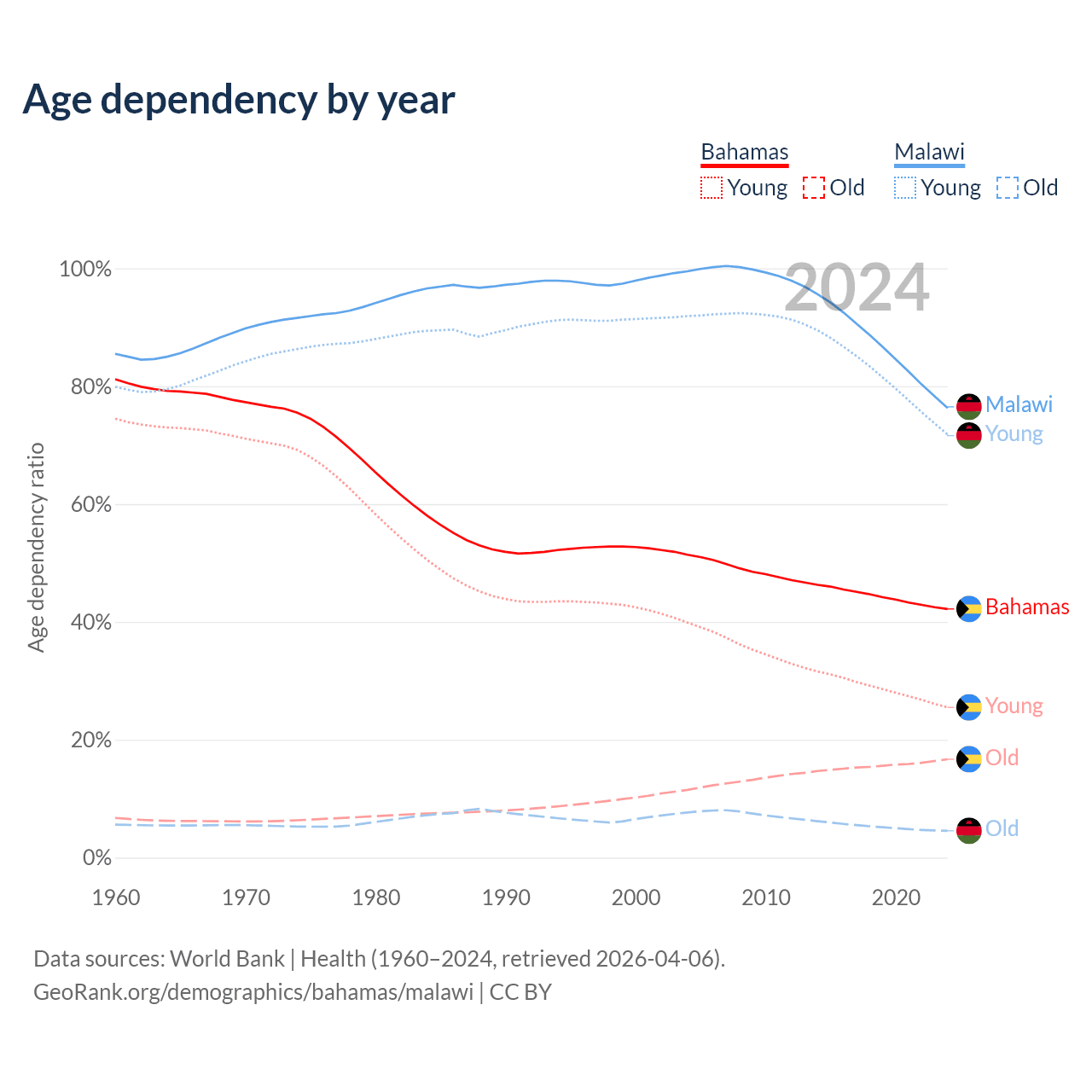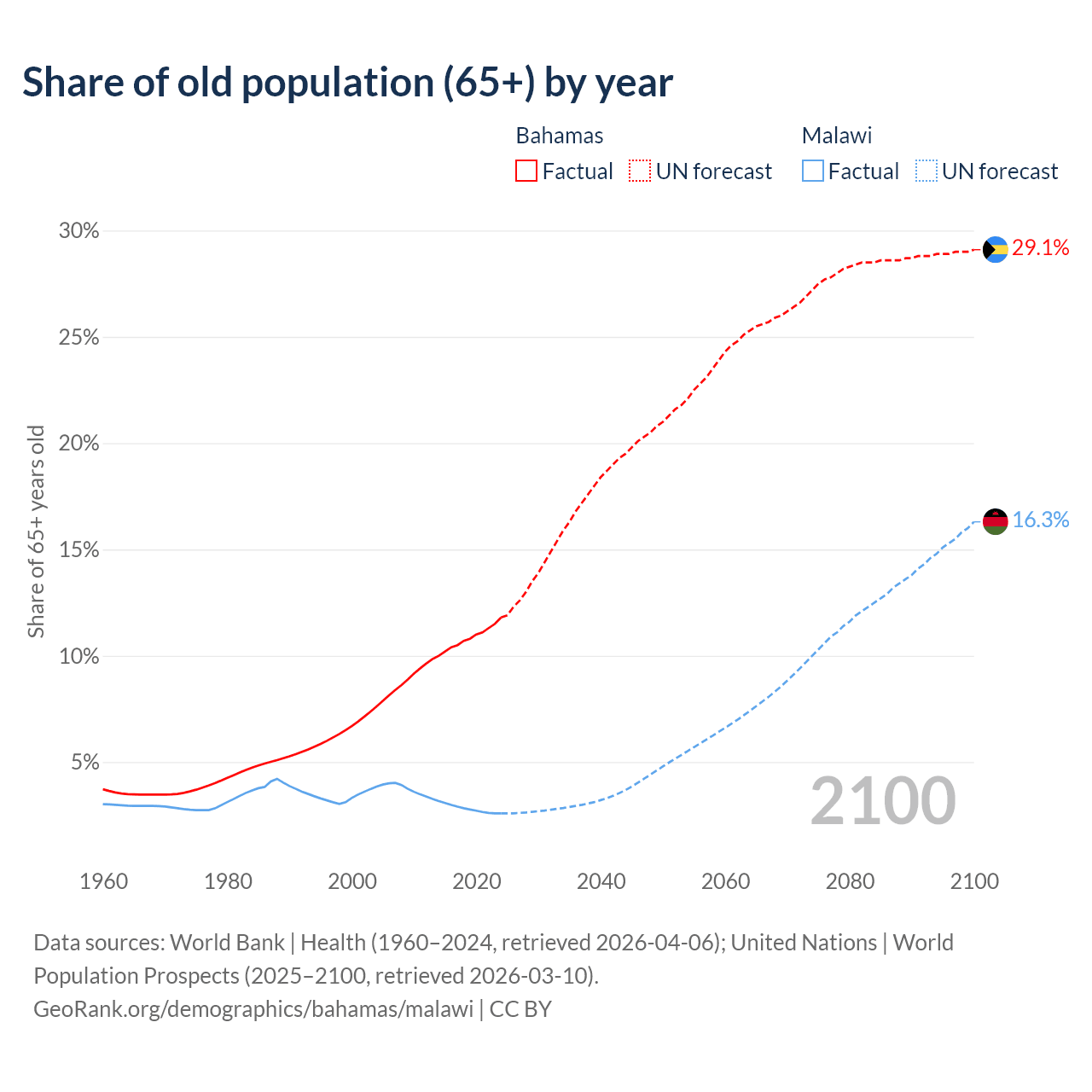 - The share of old-age demographic (65+) in the Bahamas is 11.8% vs 2.59% in Malawi.